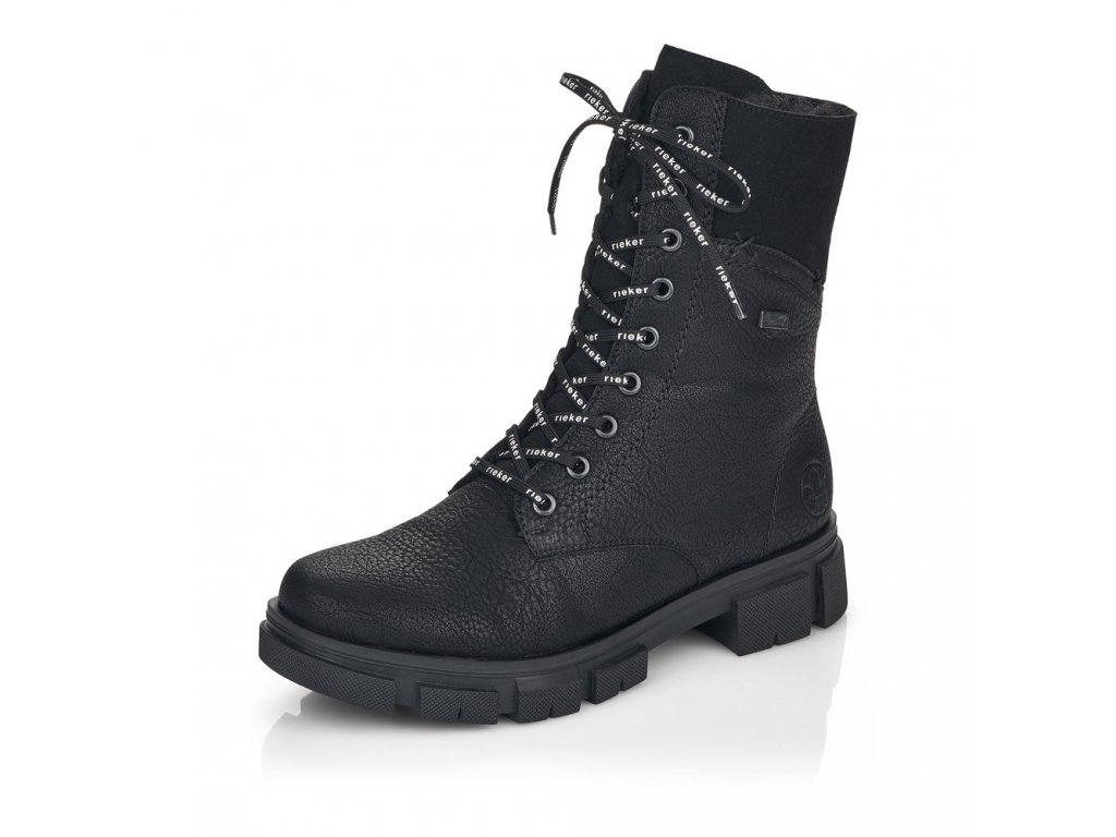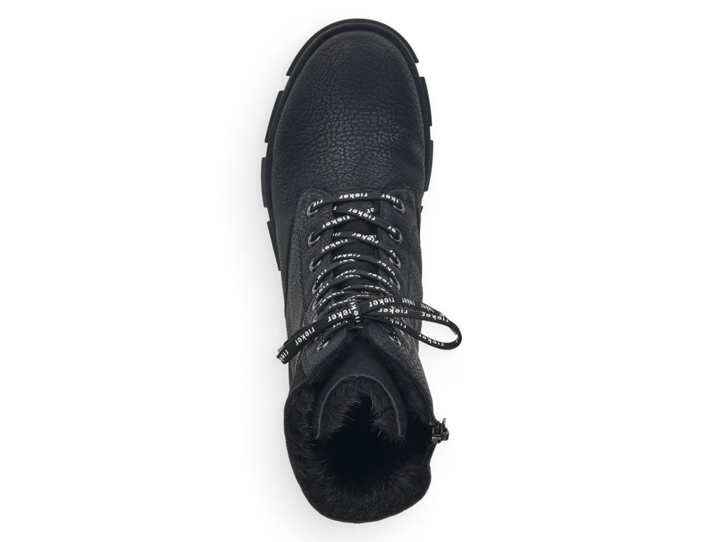 Dámské boty značky Rieker. Svršek vyroben v imitaci jemně strukturované kůže, která se snadno udržuje. Vysoké šněrování je plně funkční, slouží hlavně k nastavení dle obvodu nohy. Ke snadnému a rychlému obouvání slouží hlavně zip. Vnitřek je vyteplen textilním beránkem, zateplena je také stélka. Vyšší podešev s výraznějším vzorkem chrání od chladu ze zdola. Podešev s technologií Antistress - flexibilní podešev tlumící rázy při chůzi.