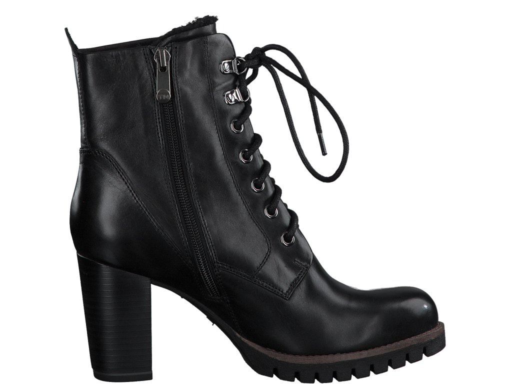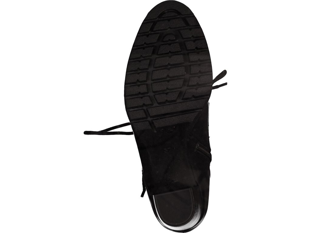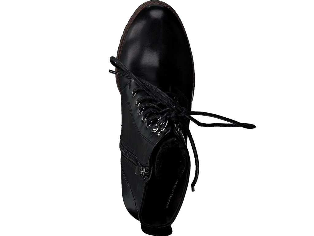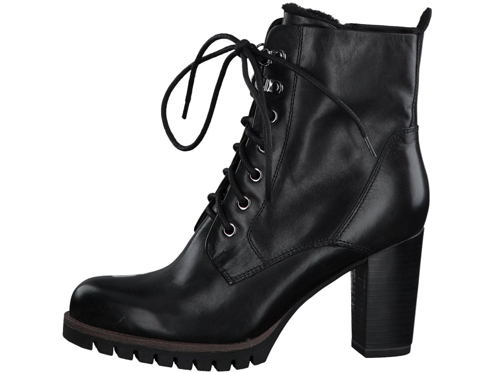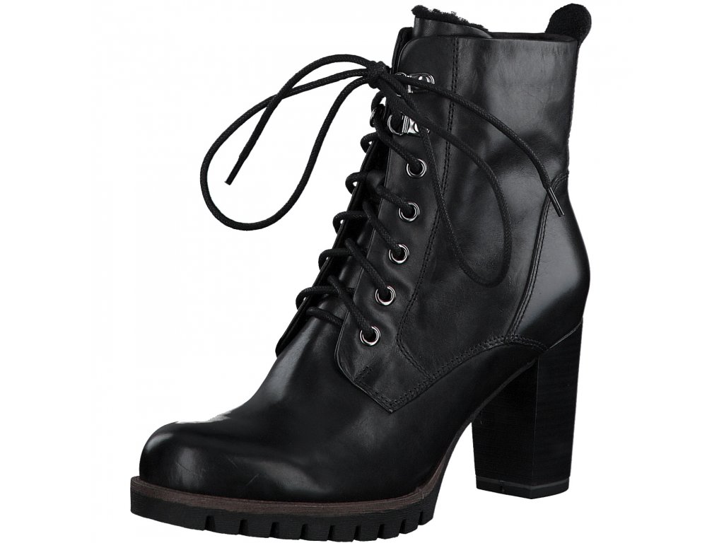 Dámské polokozačky značky Marco Tozzi. Tento extravagantní model nádherně prodlouží a zeštíhlí nohy. Model je vyroben z hladké kůže v černé jemně lesklé barvě. V podstatě klasicky - elegantně střižený svršek je posazen na kontrastní podešev - vyvýšenou, s hrubším vzorkem a vyšším podpatkem (opticky vypadá jako velmi vysoký, ve skutečnosti není, neboť i přední část podešve je 2 cm vysoká). Vnitřek je vyteplen textilní podšívkou. Zdobné tkaničky jsou funkční, slouží ale hlavně k nastavení dle šíře nohy, k jednoduchému obouvání slouží zip.
