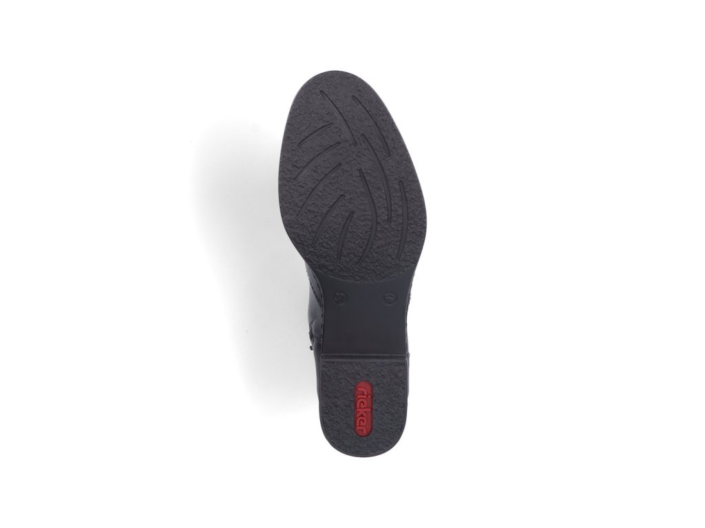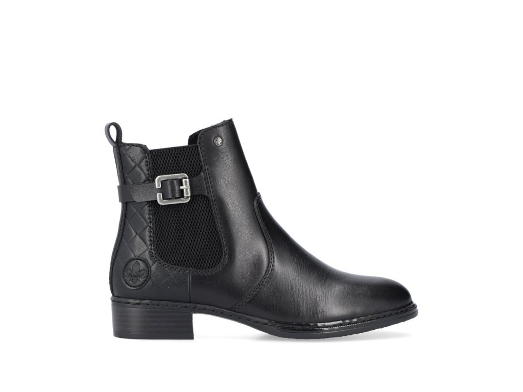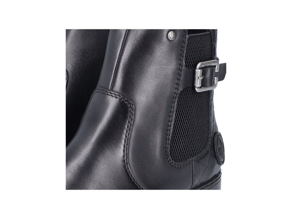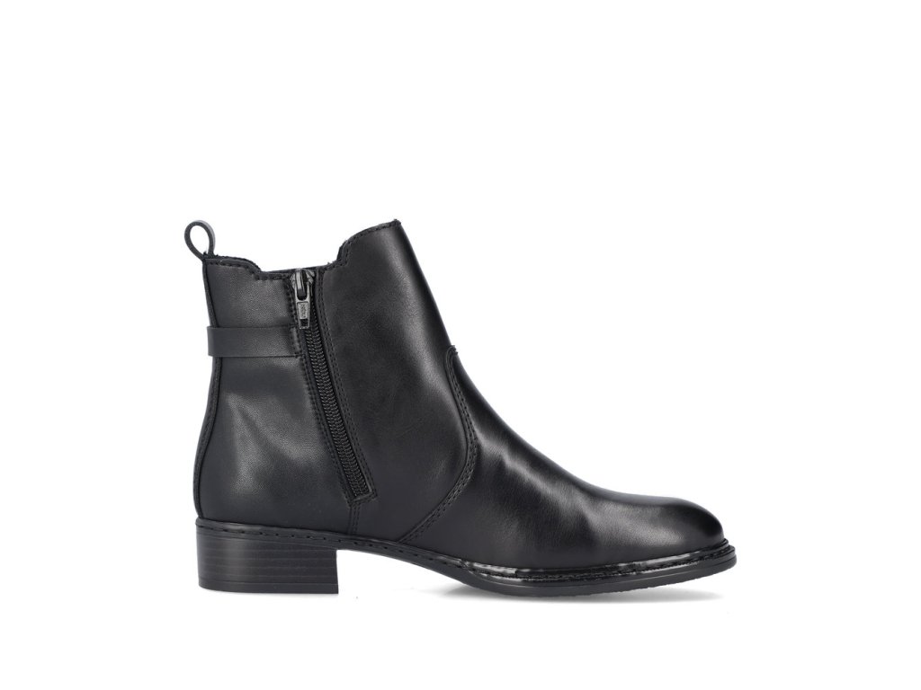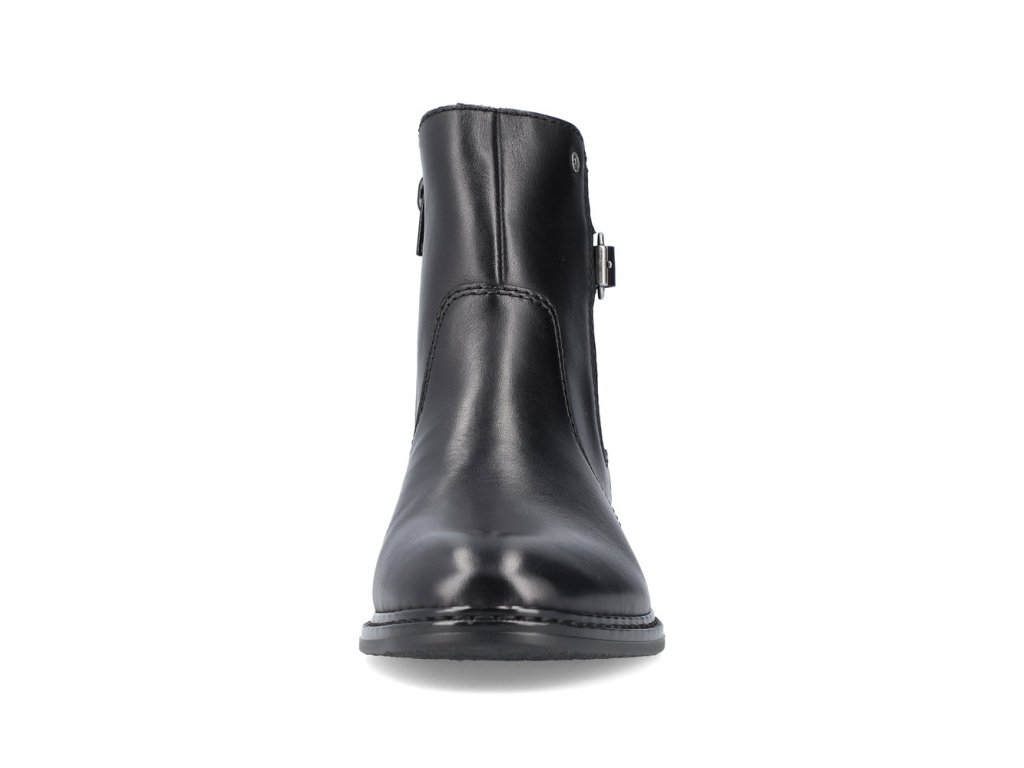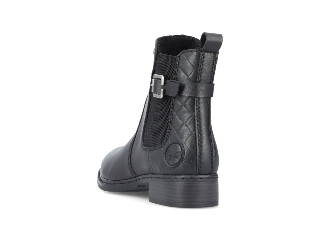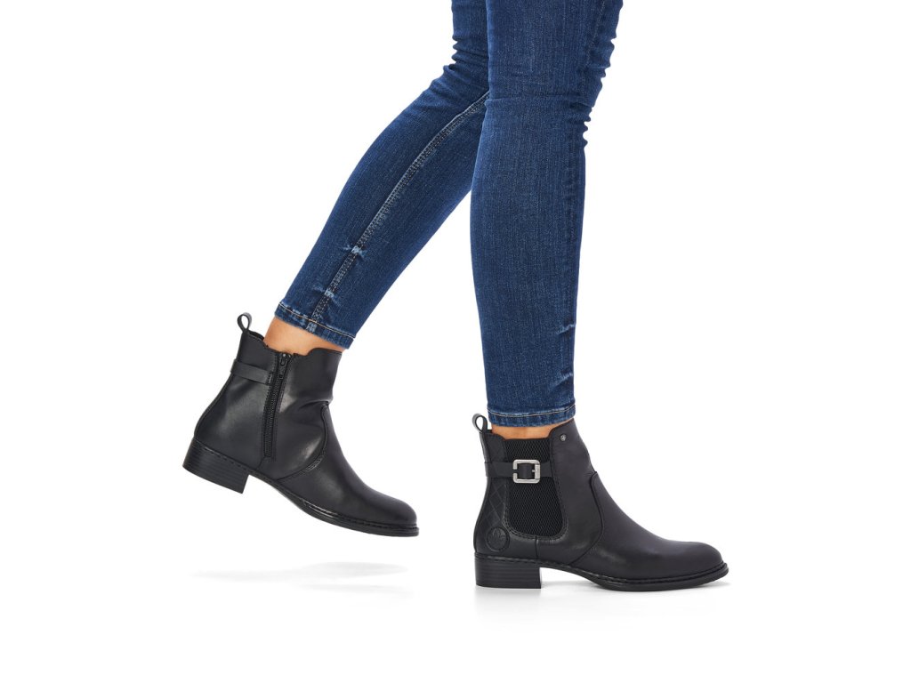 Dámské kotníčkové boty značky Rieker. Svršek je vyroben z pravé hladké kůže, zadní část je zdobena jemným karo vtlačeným vzorem. Ve spodní části je logo značky. Pružný dílec na vnější kotníkové straně je přepásán pásečkem s nastavitelnou přezkou. Obouvání pomocí zipu na vnitřní straně. Nízký podpatek pro pohodlnou a bezstarostnou každodenní chůzi. Vnitřek je vyteplen krátce střiženou fleece podšívkou, vyměkčená stélka flaušem.