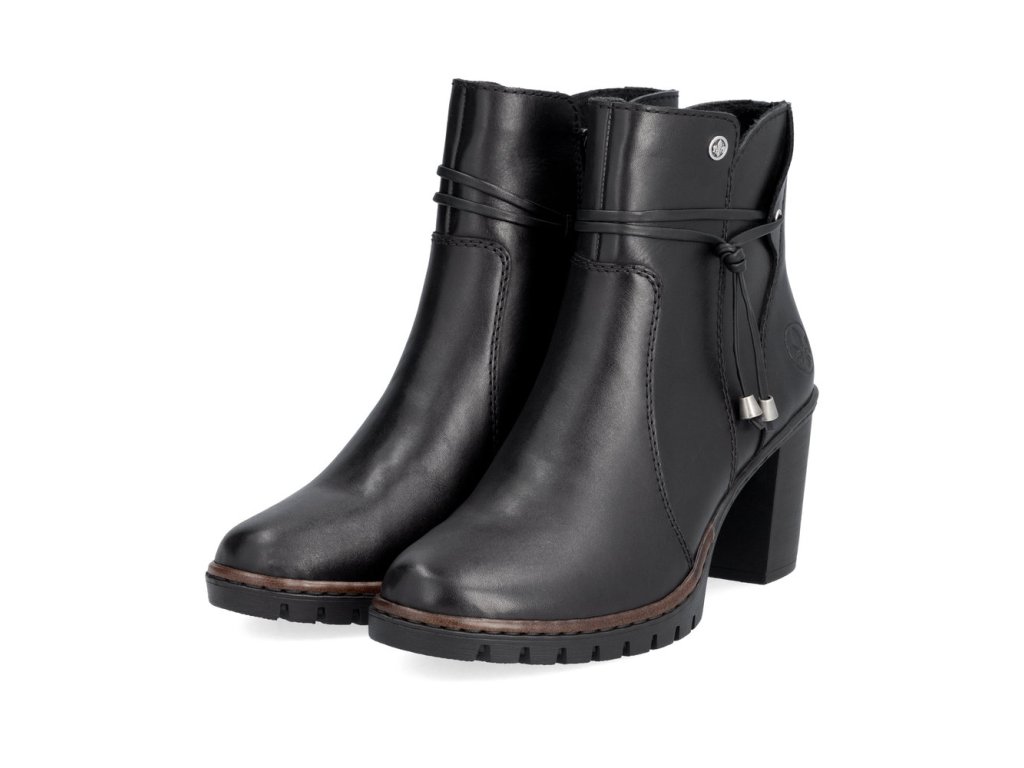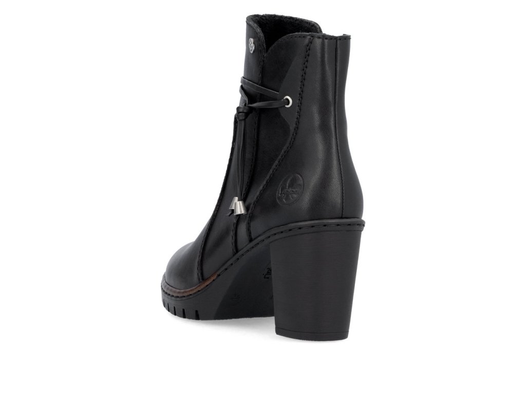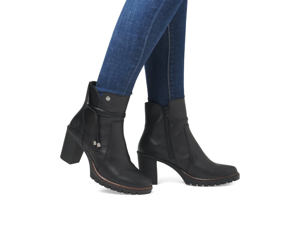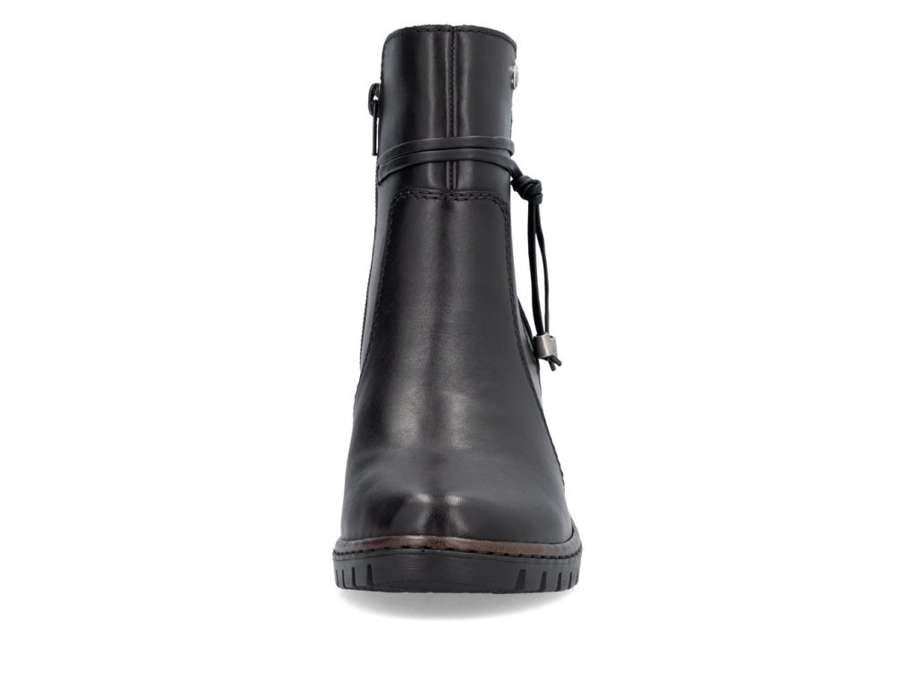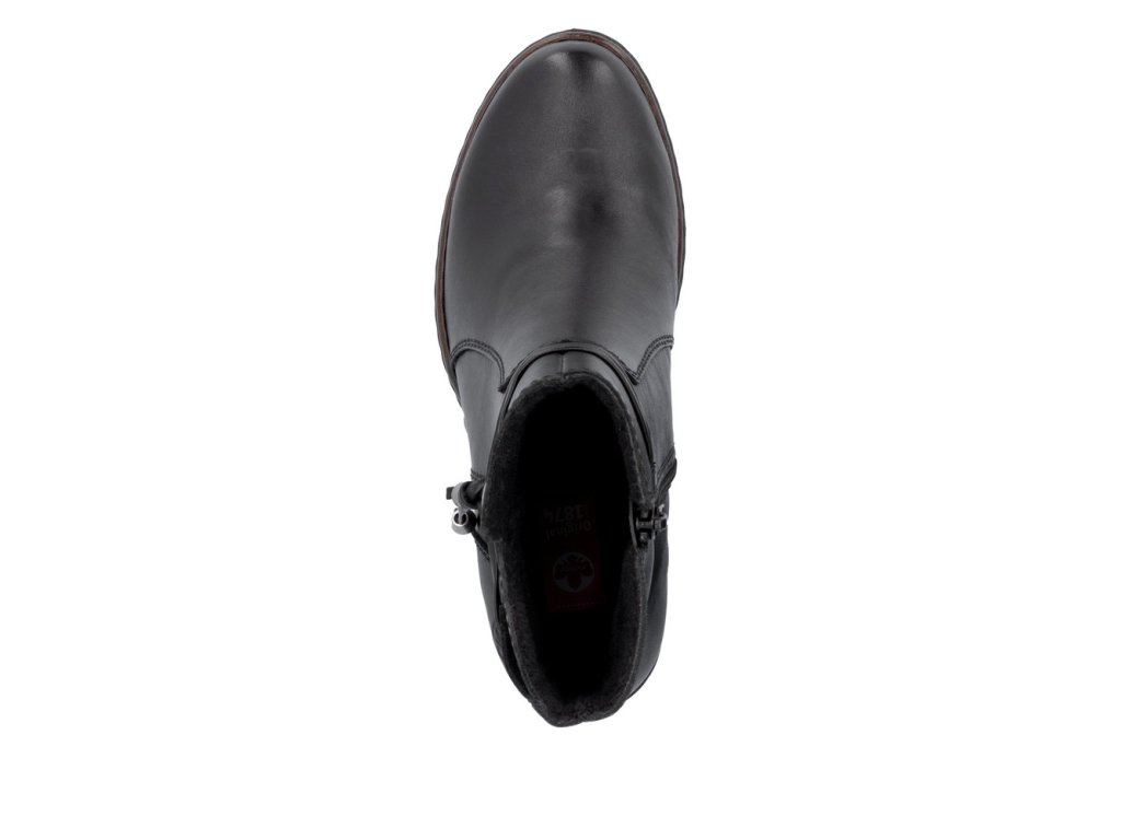 Dámské kozačky značky Rieker. Klasický kotníkový model v hladkém snadno údržbovém provedení svršku ke každodennímu pohodlného nošení. Snadné obouvání pomocí zipu. Jednoduchost střihu je zvýrazněna zajímavě řešenou horní částí a zdobnými provázky. Boty jsou vybaveny bytelnou vyšší podešví a středně vysokým klínkem. Vnitřek je vyteplen fleece podšívkou, stélka je zateplena flaušem.