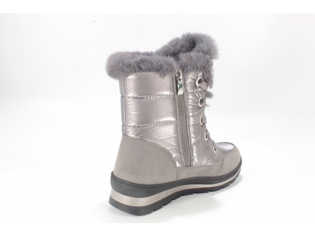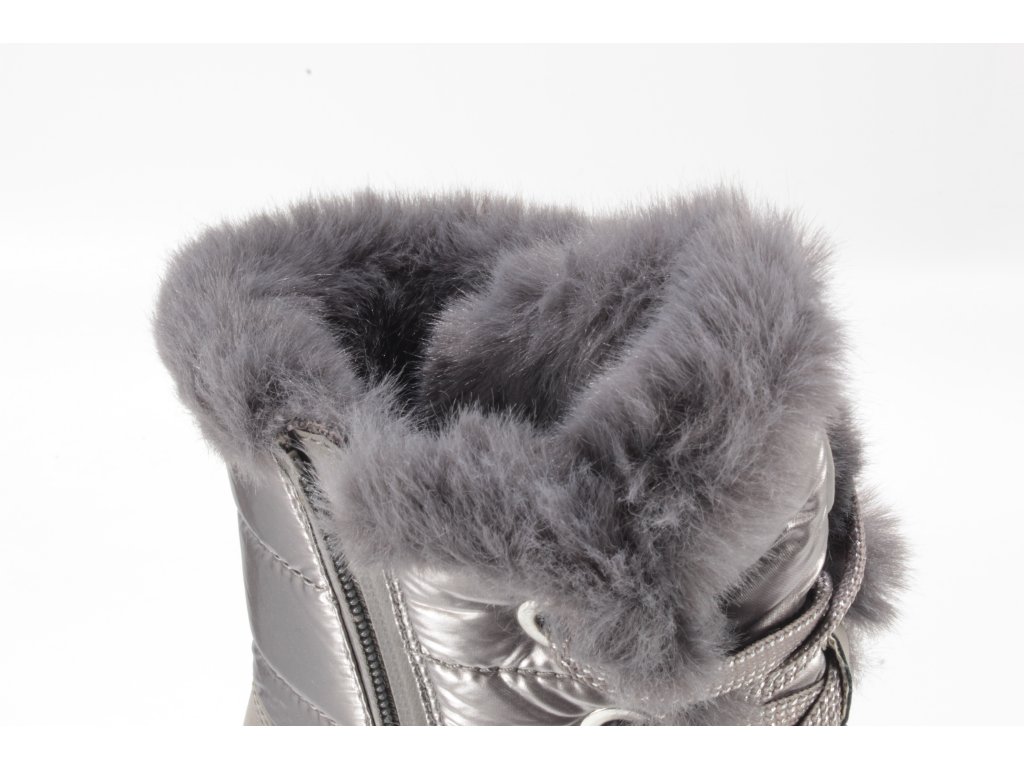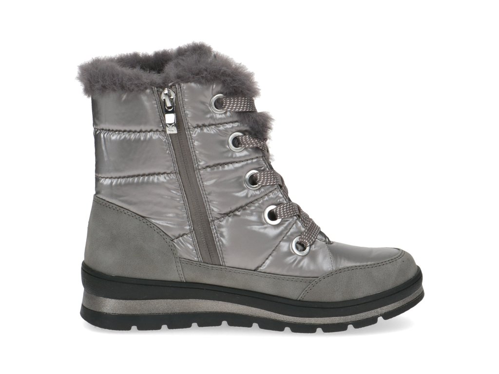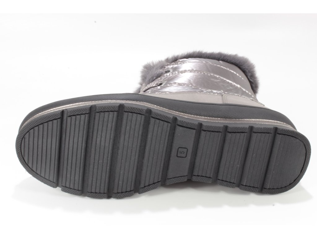 Dámské zimní sněhule značky Caprice. Spodní lem nad podešví je vyroben ze softsheele materiálu v designu broušené kůže a je vybaven vodě odpudivou TEX membránou. Ostatní část z kovově lesklého hladkého textilu rovněž ošetřeného proti propustnosti vlhka. Horní lem zdobí nádherná kožešinka, která je také v horní třetině vnitřku boty. Ostatní - spodní část podšívka je vyrobena z textilní hřejivé vlny (beránka). Tím je zateplena také stélka. Zdobné šněrování slouží hlavně k nastavení dle potřeb lýtka, ke snadnému obouvání slouží hlavně zip. Vyšší podešev v barevné kombinaci černo- stříbrné, skvěle dolaďuje celkový vzhled boty. Podešev s protiskluznou úpravou.