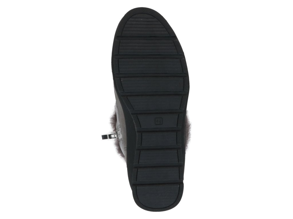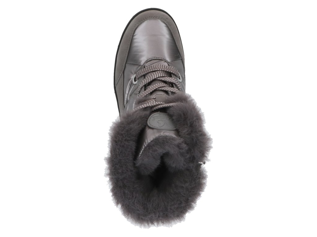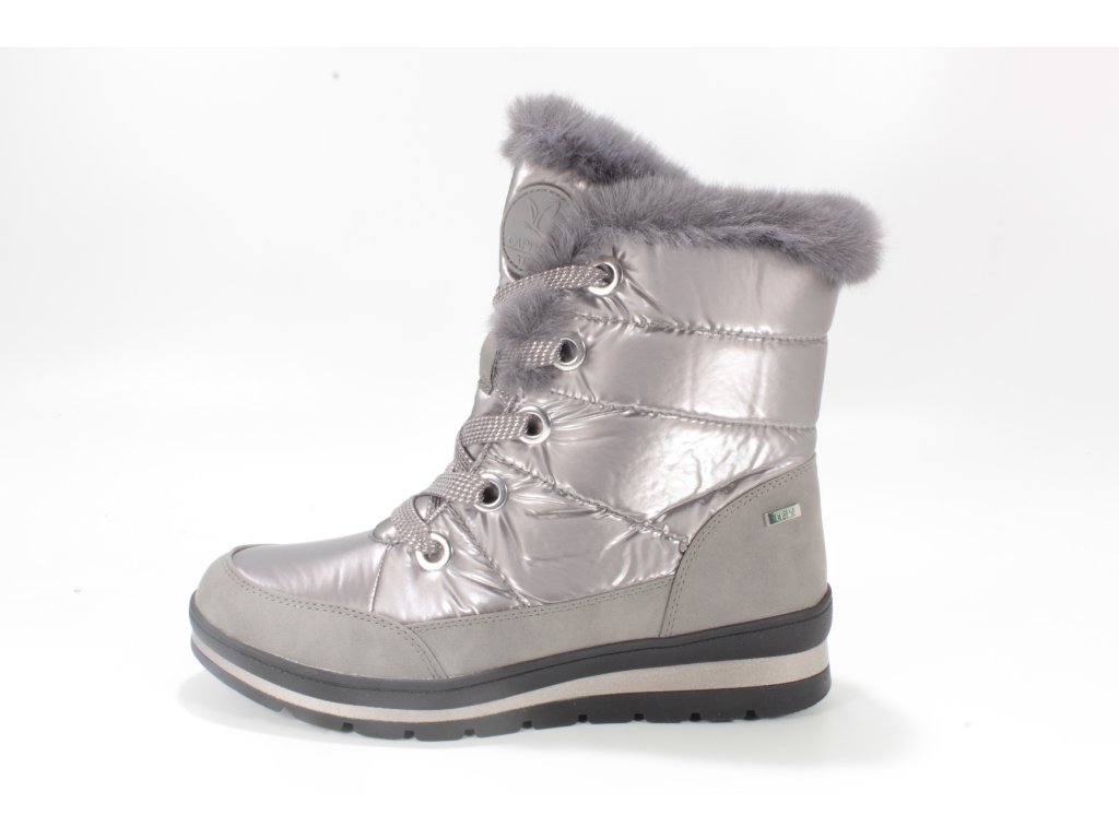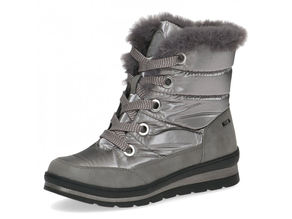 Dámské zimní sněhule značky Caprice. Spodní lem nad podešví je vyroben ze softsheele materiálu v designu broušené kůže a je vybaven vodě odpudivou TEX membránou. Ostatní část z kovově lesklého hladkého textilu rovněž ošetřeného proti propustnosti vlhka. Horní lem zdobí nádherná kožešinka, která je také v horní třetině vnitřku boty. Ostatní - spodní část podšívka je vyrobena z textilní hřejivé vlny (beránka). Tím je zateplena také stélka. Zdobné šněrování slouží hlavně k nastavení dle potřeb lýtka, ke snadnému obouvání slouží hlavně zip. Vyšší podešev v barevné kombinaci černo- stříbrné, skvěle dolaďuje celkový vzhled boty. Podešev s protiskluznou úpravou.