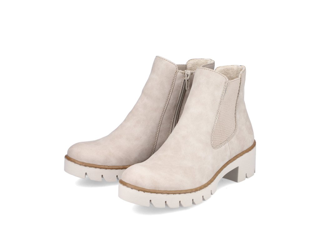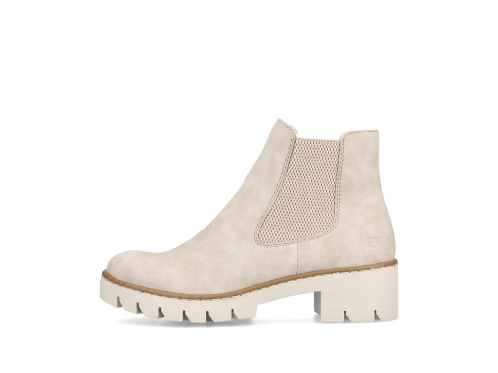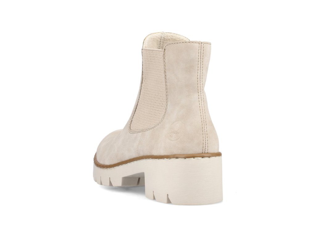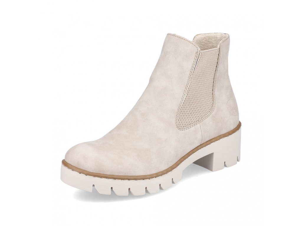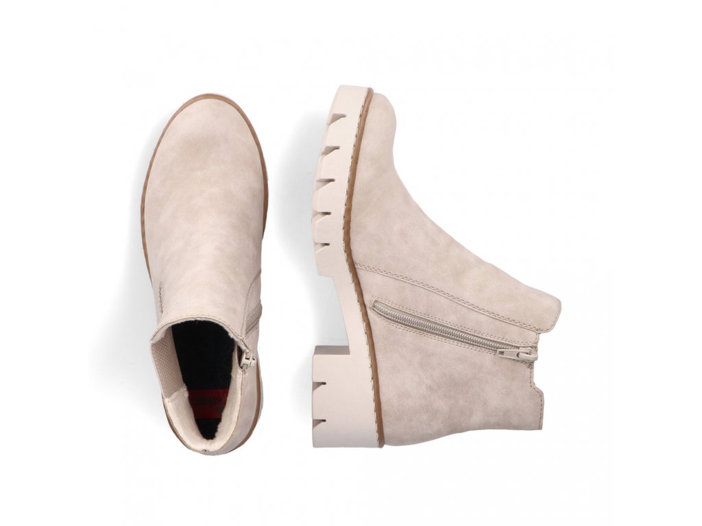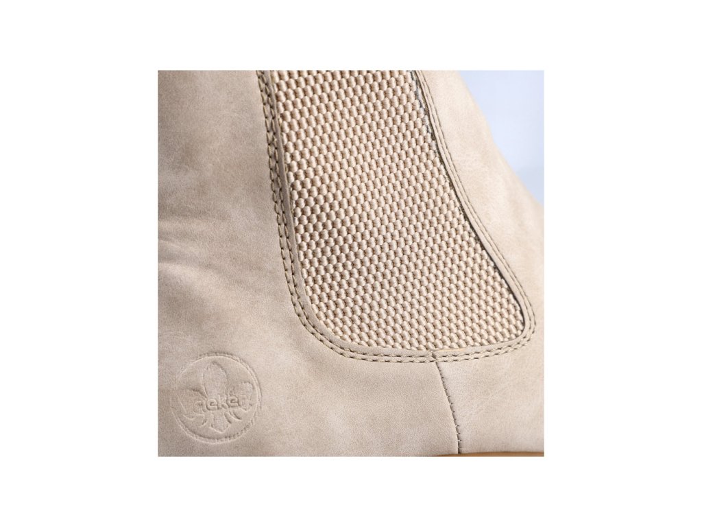 Dámské boty - pérka značky Rieker. Model v béžové barvě v úpravě semiše s pružným klínem na vnější straně kotníku je doplněn výraznou podešví ve stejné barvě. Hnědý lem po obvodu kopíruje tvar podešve a ještě více ji zvýrazňuje, zároveň působí jako pěkný estetický prvek. Vnitřek je mírně vyteplen textilním jemným chloupkem. Stélka je vyměkčená a zateplena filcem. Obuv je tak vhodná již od prvních chladnějších podzimních dní. Není určena pro tuhou velmi studenou zimu, kdy teploty klesají do mínusu. Podešev s technologií Antistress.