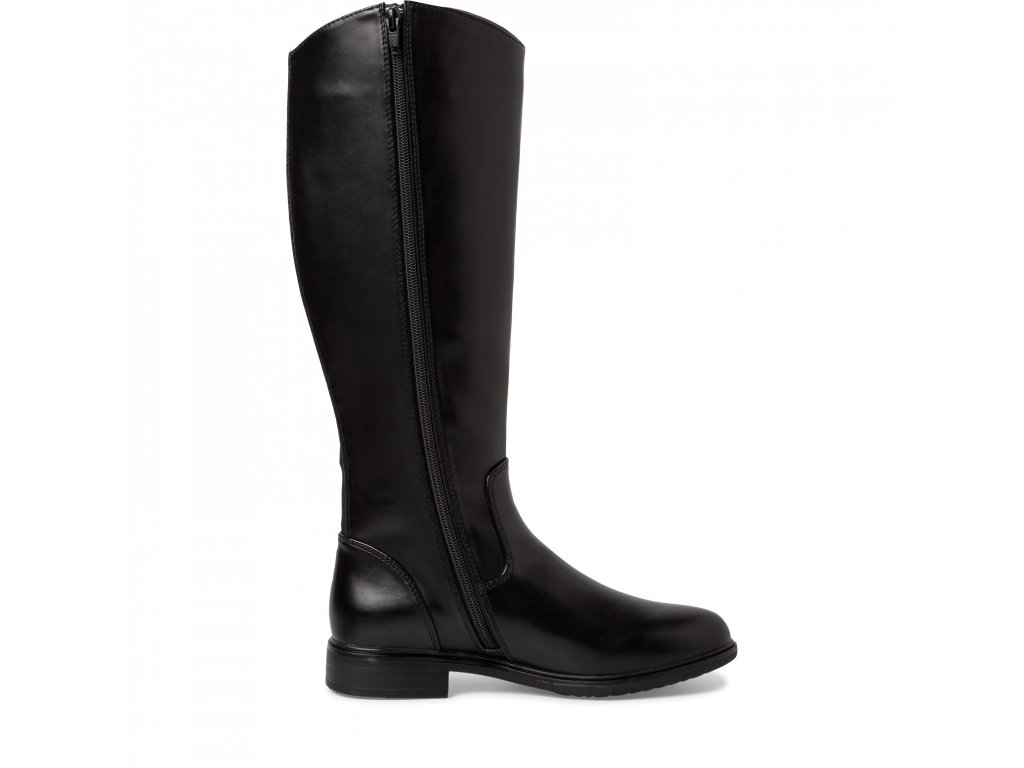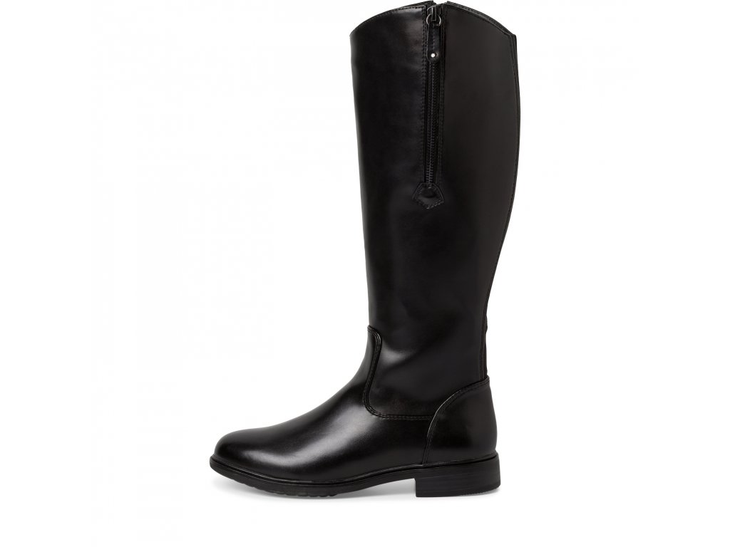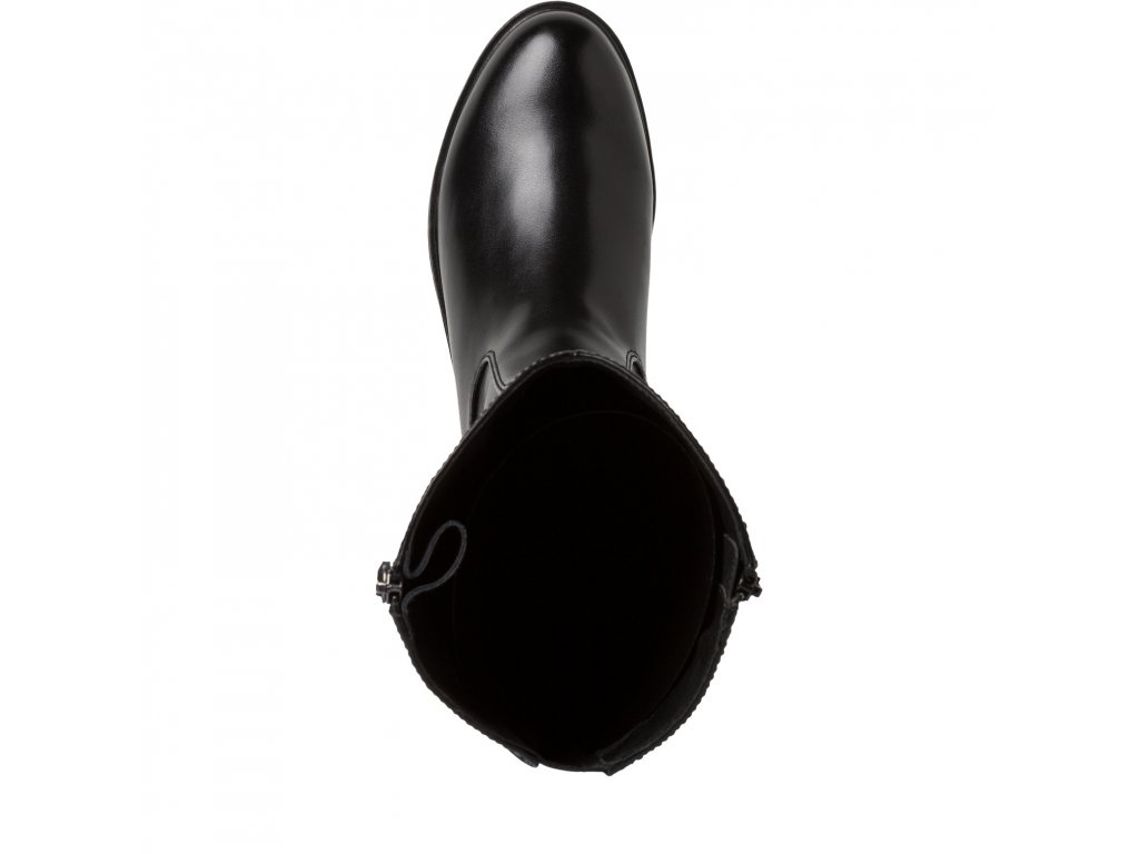 Luxusní kozačky značky Jana. Svršek je vyroben z eko kůže v černé barvě. Klasický kozačkový střih je na vnější straně lýtka doplněn okrasným zipem. Ten je ale také funkční, pod ním se skrývá možnost ho rozepnout dle potřeb a zvětšit tak obvod lýtka až o 2 cm. Vnitřek je vyteplen textilní podšívkou. Stélka je vyrobena z paměťové pěny a potažena eko kůží. Snadné obouvání pomocí zipu na vnitřní straně lýtka. Podešev v temně hnědé barvě je dostatečně vysoká, aby chránila před chladem ze spodu.