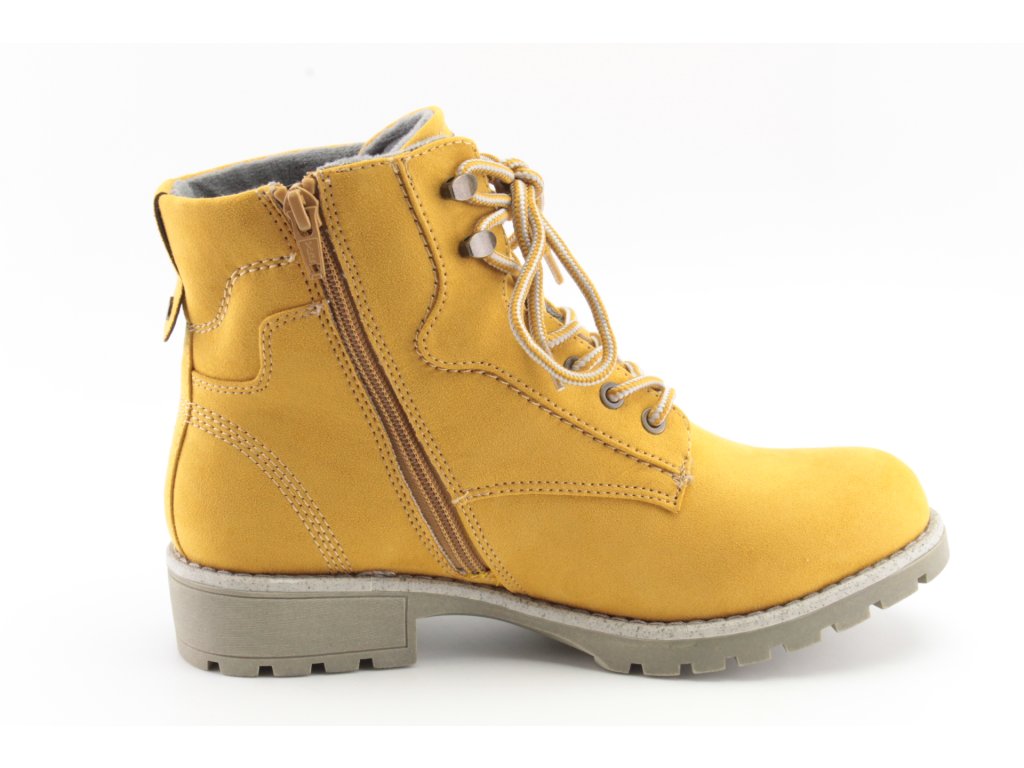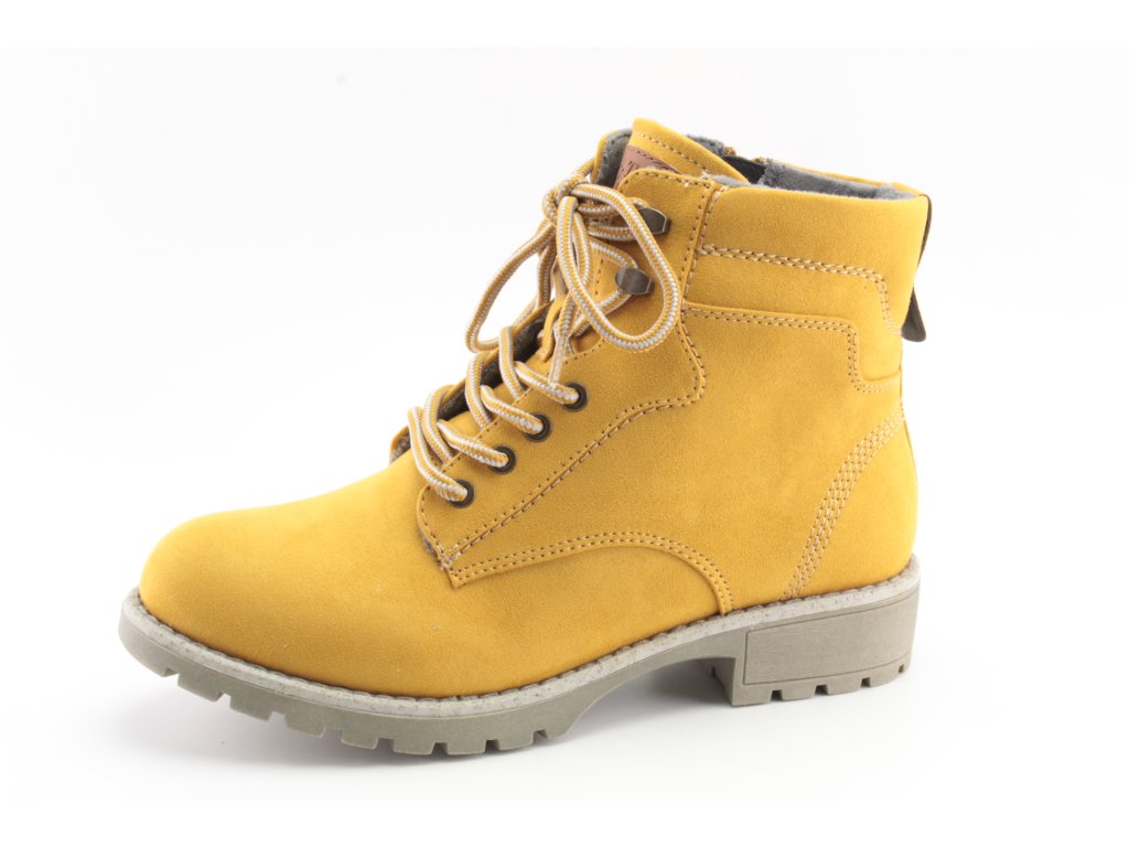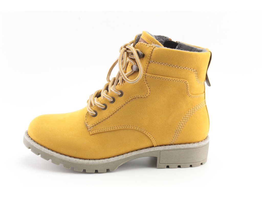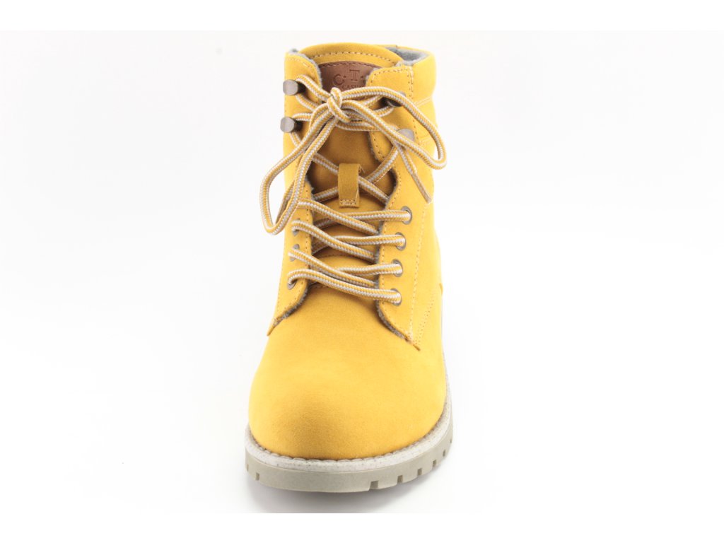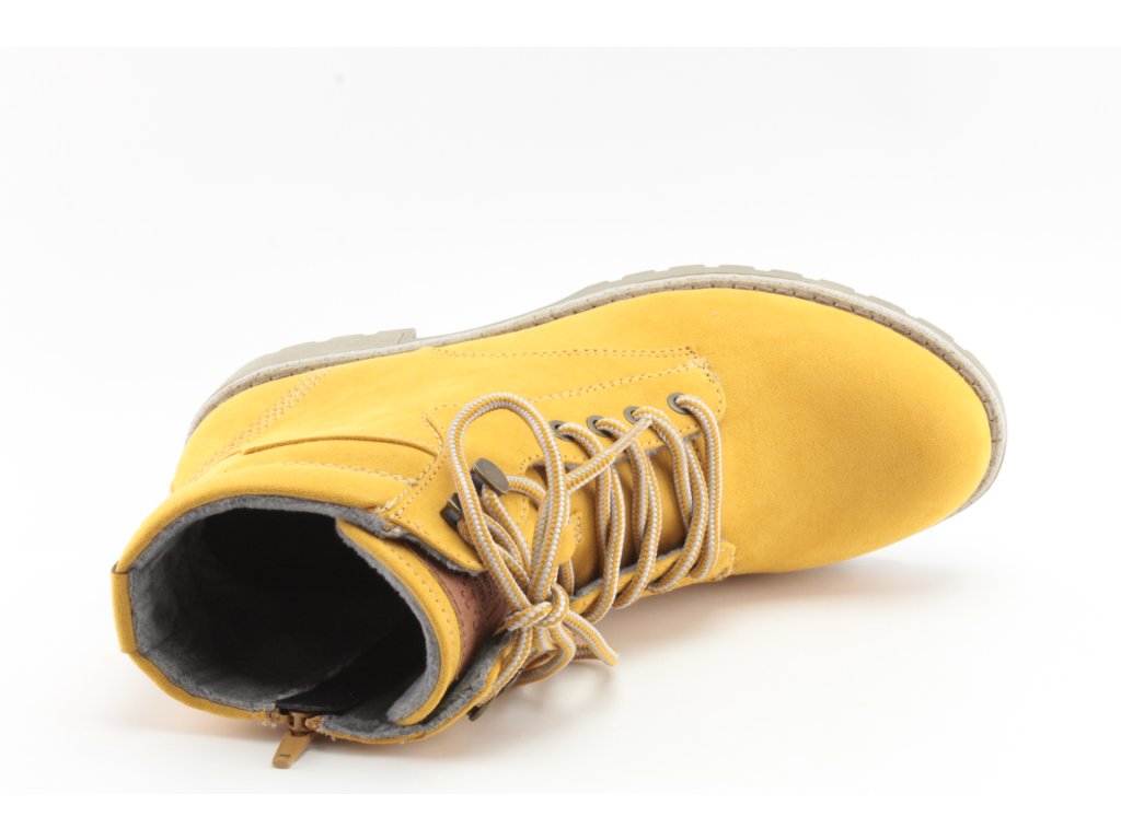 Dámské zimní kotničkové boty značky Jana z její řady Soft Line. Svršek je vyroben v designu semiše v hořčicové barvě. Vzor je decentně ozdoben dvoubarevnými tkaničkami a cvočkem na zadní straně nadkotníkového límce. Traktorový typ podešvě není nikterak robustní a skvěle doplňuje celkově nenápadnější design těchto bot. Šněrování slouží hlavně k nastavení šíře bot, nemusí se jinak používat. K obouvání slouží hlavně zip na vnitřní straně bot. Vnitřek je vyteplen krátce střiženou fleece podšívkou. Tou je zateplena také měkká stélka.