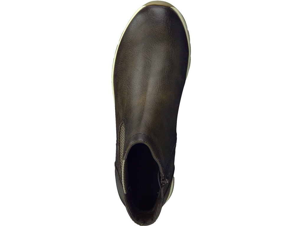 Dámské kotníčkové boty v hnědé hladké úpravě s výraznou dynamickou podešví. Svršek je vyroben v imitaci kůže a přes kotník doplněn pružnou vsadkou . Snadné obouvání pomocí zipu. Vnitřek je lehce vyteplen textilní podšívkou. Obuv je vhodní již od podzimu, přes mírnější zimu do jara. Stélka je příjemně vyměkčená. Nevětším lákadlem je ale podešev - ve výrazné bílo-černé kombinaci. Nízký klínek skvěle podpoří klenbu nohy. Vzorek je výrazný. Podešev je flexibilní a tlumí rázy při došlapu.