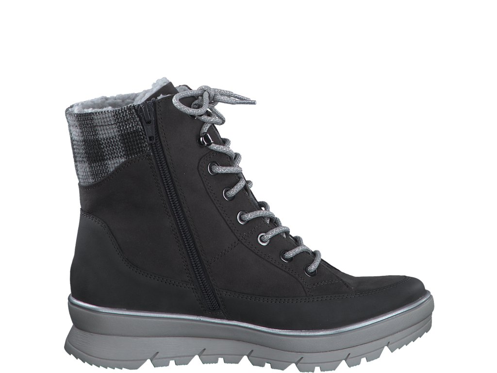 Dámské zimní kotníčkové boty značky Jana. Svršek je vyroben v designu broušené kůže v tmavší šedé barvě. Nad kotníkem je bota zakončena textilním límcem v designu kara. Vzor je decentně ozdoben stříbrnými tkaničkami., Traktorový typ podešve není nikterak robustní a skvěle doplňuje celkový vzhled těchto bot. Šněrování slouží hlavně k nastavení šíře bot, nemusí se jinak používat. K obouvání slouží hlavně zip na vnitřní straně bot. Vnitřek je vyteplen textilním beránkem. Stélka je přijemně vyměkčena a zateplena filcem.