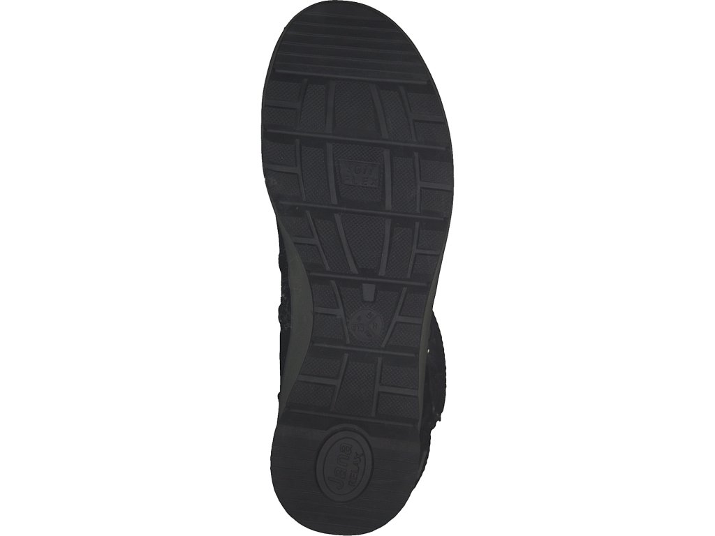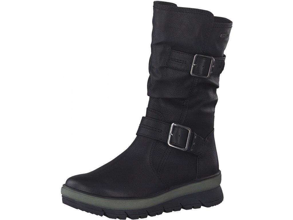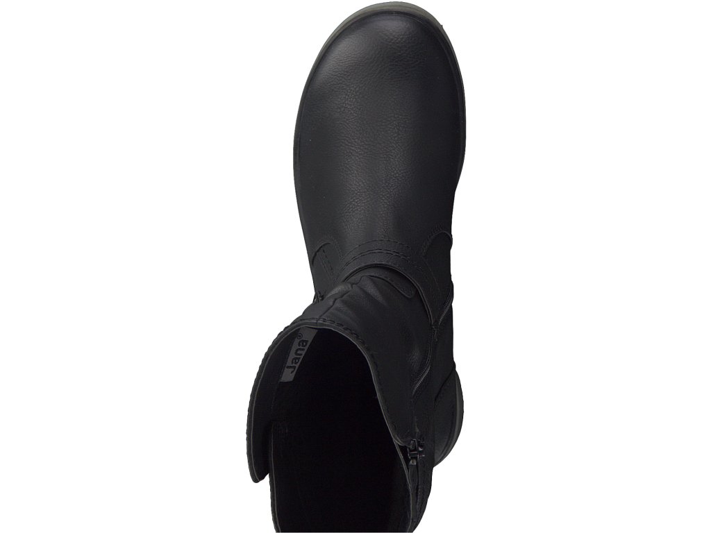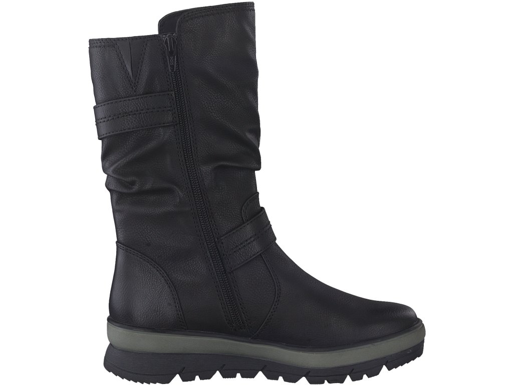 Dámské kozačky značky Jana. Pohodlný vzor na nízkém klínku, snadné zapínaní na zip. Vnitřek je vyteplen černým textilním beránkem, zateplena je také stélka. Svršek je hladký, snadno omyvatelný, v lýtkové části je mírně nakrčen a dozdoben širšími pásky s přezkou. Vyšší podešev chrání před mrazem ze spoda a také svršek před zašpiněním.