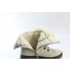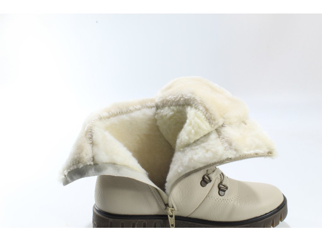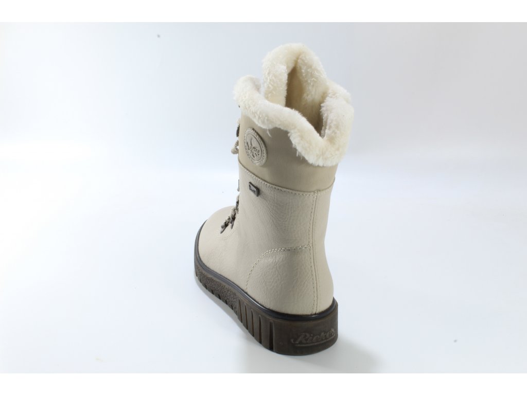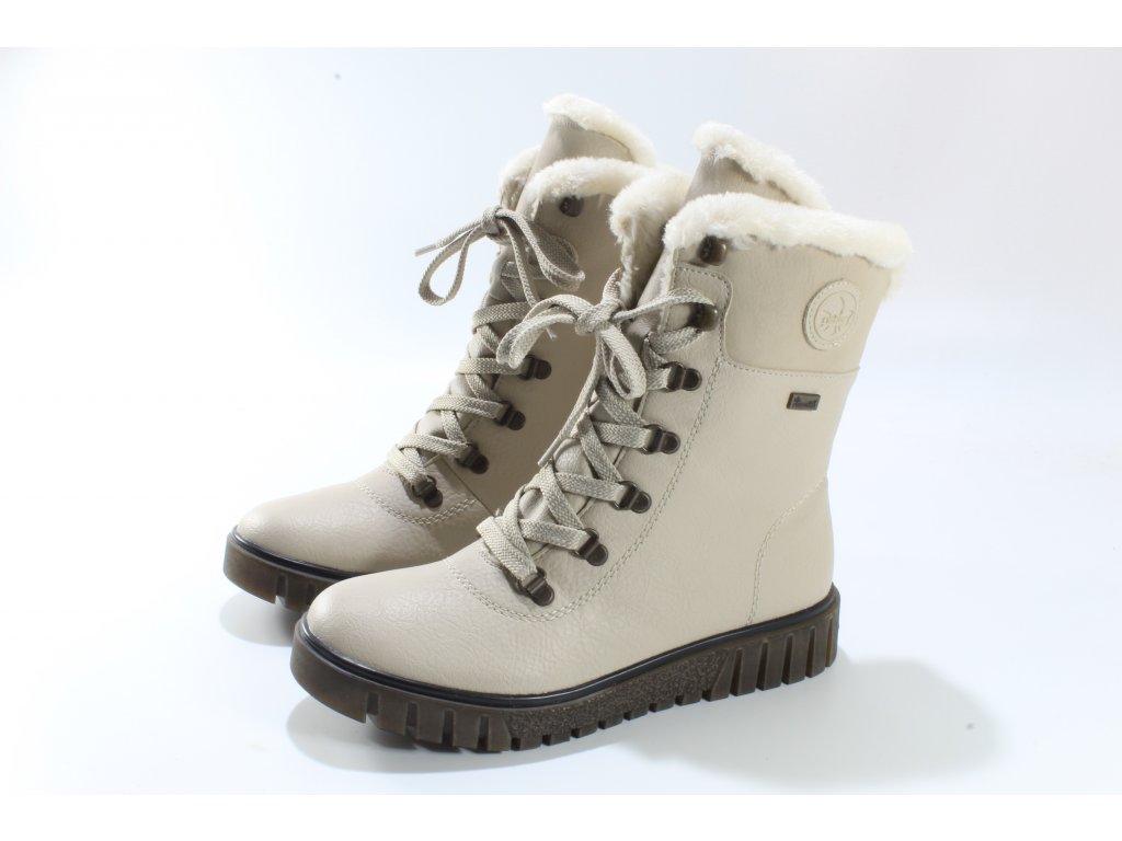 Dámské zimní boty značky Rieker. Svršek je vyroben v imitaci hladké kůže v odstínu kouřové - jemné béžové barvě. Šněrování slouží hlavně k nastavení dle šíře nohy, ke snadnému obouvání slouží hlavně zip na vnitřní straně boty. Podšívka je velice hřejivá - střižní beránek. Vše doplněno výraznou vyšší podešví, která chrání svršek proti zašpinění a nohy proti chladu zespoda. Podešev na mírném klínku pod patou je vybavena technologií Antistress - tlumící rázy při chůzi.