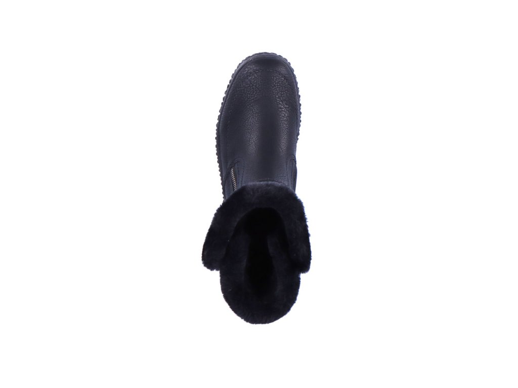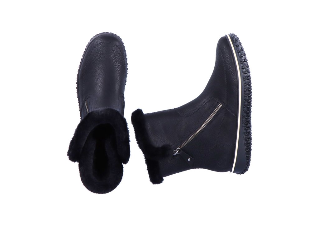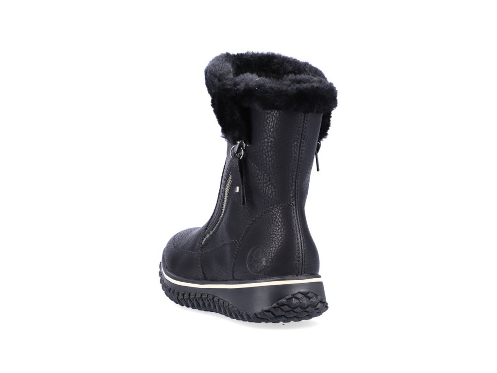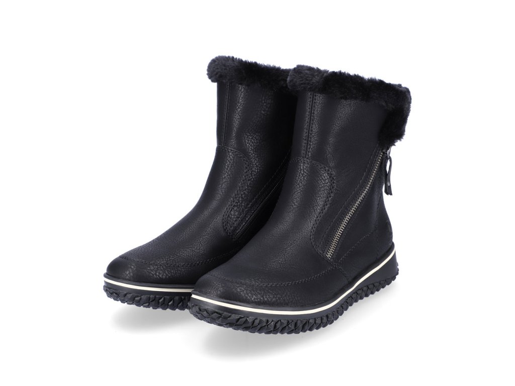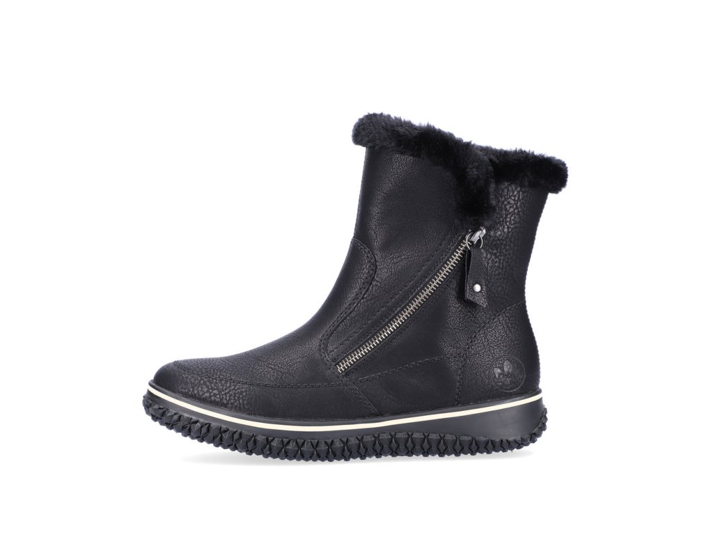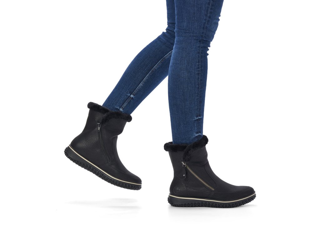 Dámské boty značky Rieker. Svršek je vyroben v imitaci surové kůže v černé barvě. Oba dva šikmé zipy jsou plně funkční a spolu s černým kožíškem lemující horní část dodávají těmto nízkým kozačkám módní švih a jemnou eleganci. Na vnější straně je zdoben logem značky. . Moderní a v posledních letech oblíbená Creazy podešev je nejen zajímavá, ale díky robustnějšímu vzorku také praktická. Vnitřek je vyteplen příjemně teplým textilním beránkem, zateplena je také stélka. Podešev na mírném klínku s technologií Antistress - flexibilní podešev tlumící rázy při chůzi.