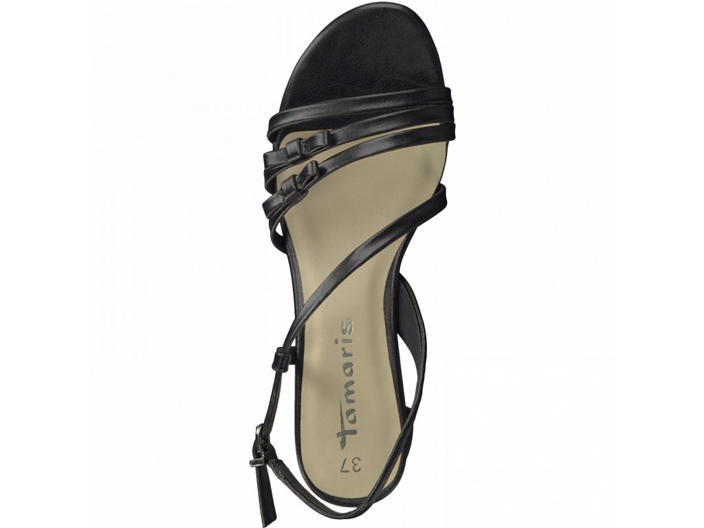 Dámské sandály značky Tamaris. Nadčasový léty ověřený páskový model v univerzální černé barvě vhodný jak pro letní teplé dny, tak pro jakékoliv společenské události včetně plesů. Dva pásečky jsou jemně okořeněné malými mašličkami. Pro pohodlnou bezstarostnou chůzi jsou vybaveny středně vysokým širším tzv. "špalkovým" podpatkem, protiskluznou technologií, vyměkčenou stélkou a patním páskem na klasickou kovovou přezku.