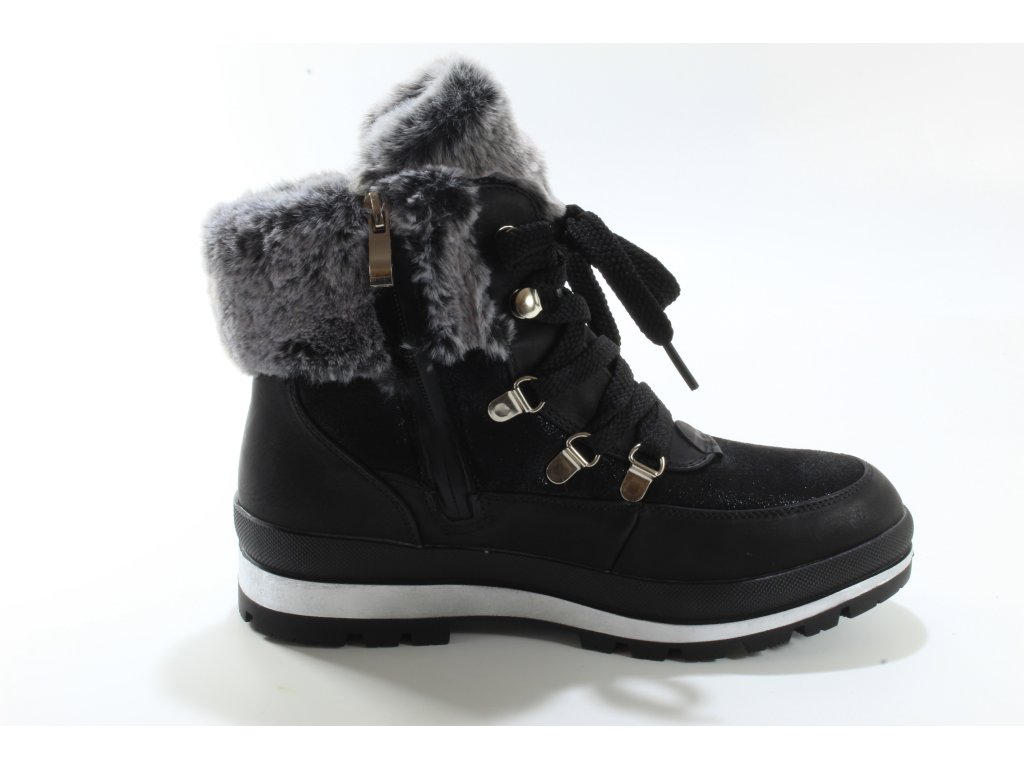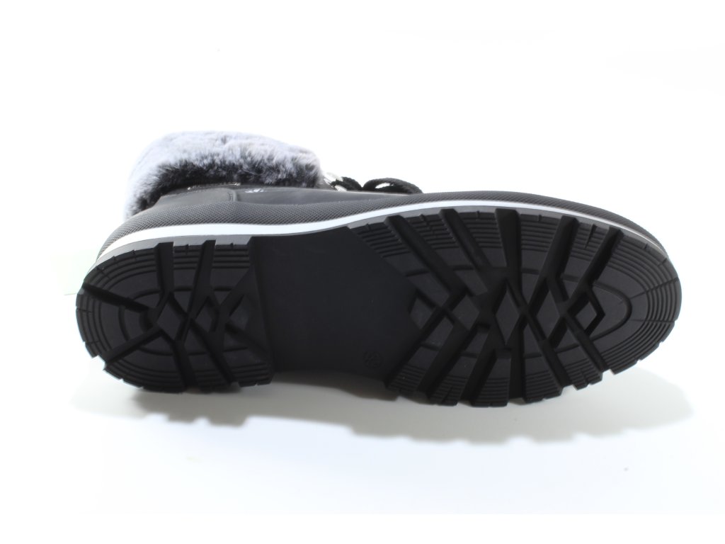 Dámské zimní boty v moderním tvaru a designu černé doplněné kovově stříbrnou a šedou barvou. Vyšší podešev s hrubým vzorkem je vyrobena z polyuretanu. Ten skvěle přilne k povrchu a zamezuje klouzání. Kovová vrstva v sobě ukrývá technologii ochrany proti rázu při chůzi (pruží) a zároveň je hlavní izolant proti chladu zespoda. Svršek nad podešví začíná hladkým syntetickým lemem - bota je tak snadno omyvatelná a nelepí se na ní sníh. Horní část je vyrobena textilu v designu broušeného plyše, díky této úpravě se na slunci mírně leskne. Lem kolem kotníku je z vnější i z vnitřní strany z příjemného teploučkého kožíšku v šedé barvě. Celá bota je vyteplena textilním černým beránkem, stélka flaušem. Zdobné šněrování je plně funkční, slouží ale hlavně k nastavení boty dle obvodu nohy. Ke snadnému obouvání slouží hlavně zip na vnitřní straně .