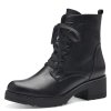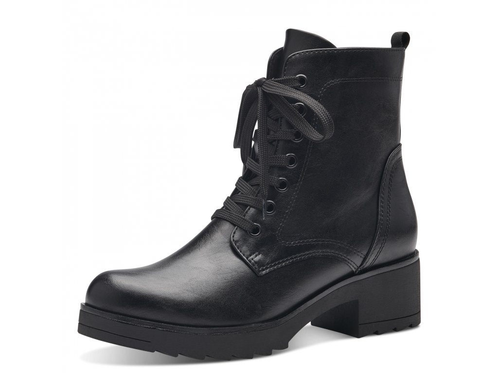 Dámské boty značky Marco Tozzi v provedení hladké černé barvy. Šněrování je plně funkční, slouží hlavně k nastavení dle obvodu nohy, ke snadnému obouvání slouží hlavně zip. Vnitřek je vyteplen textilní podšívkou - fleece chlupem. Zateplena je také stélka. Stabilní podpatek s ideální výškou pro každodenní nošení.