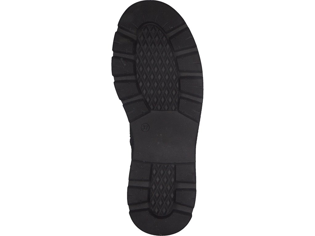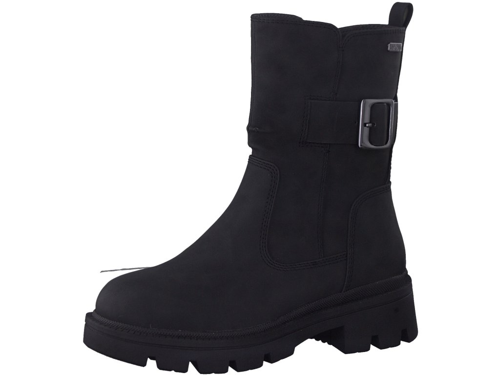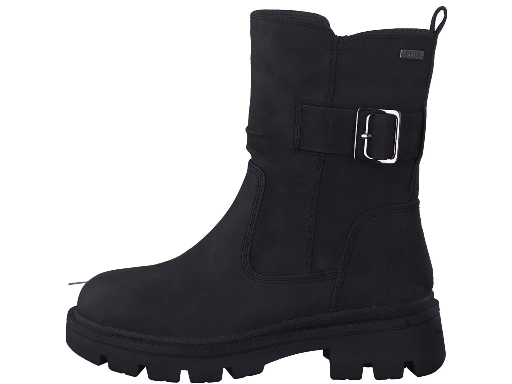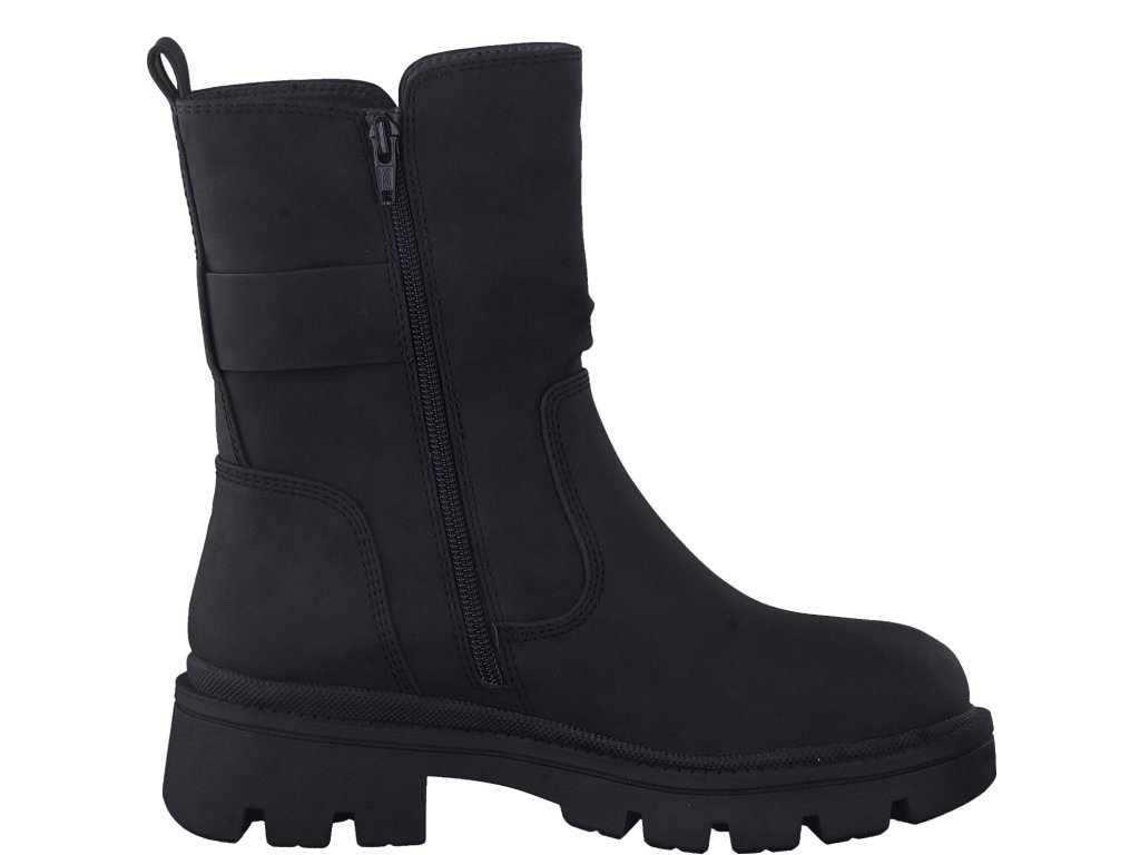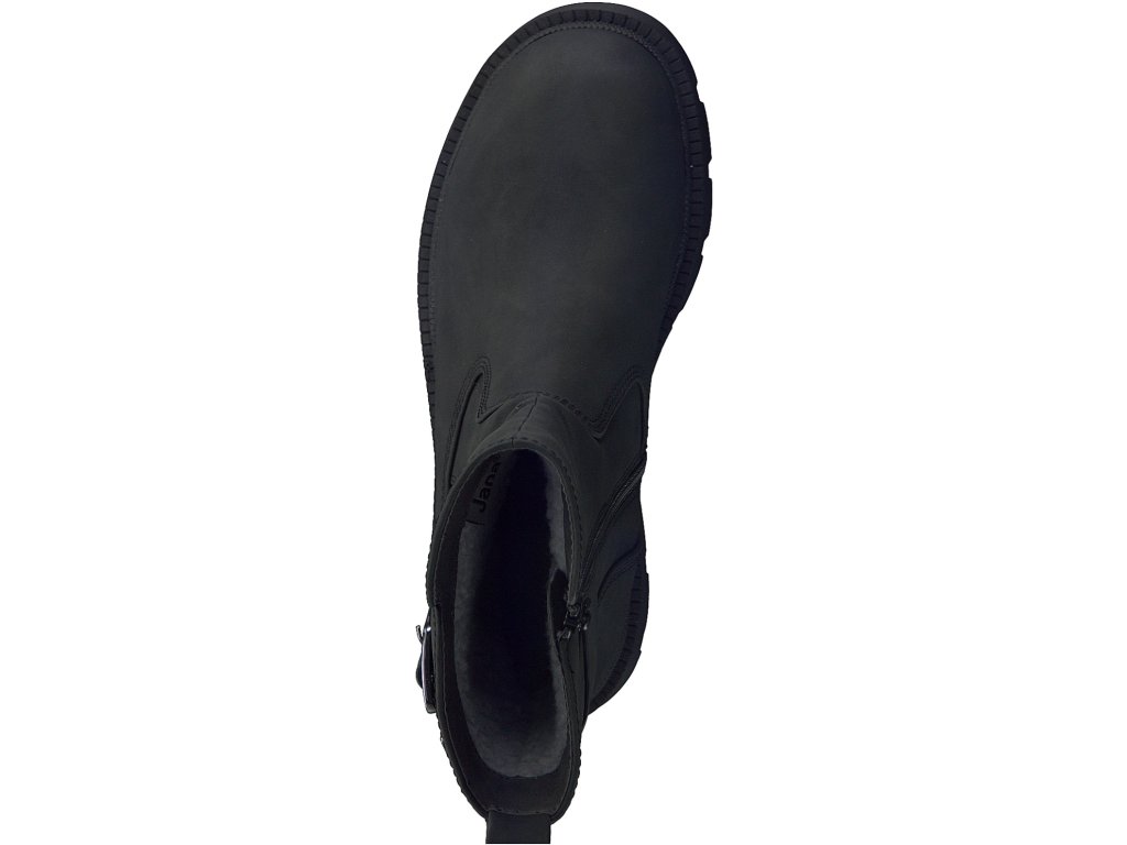 Dámské kozačky značky Jana. Středně vysoký model v provedení hladkého snadno udržovatelného svršku v černé barvě zdobeného jemným nakrčením materiálu nad nártem a páskem s přezkou. Snadné obouvání pomocí zipu. Vnitřek je vyteplen textilní podšívkou. Vyšší podešev toho nejen hodně snese, ale také chrání nohy od chladu ze spodu. Boty se hodí jak k sukním, tak pohodlně do nic strčíte nohavice kalhot.