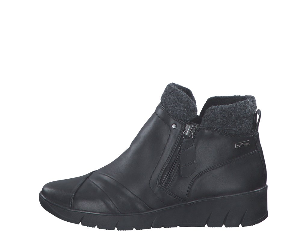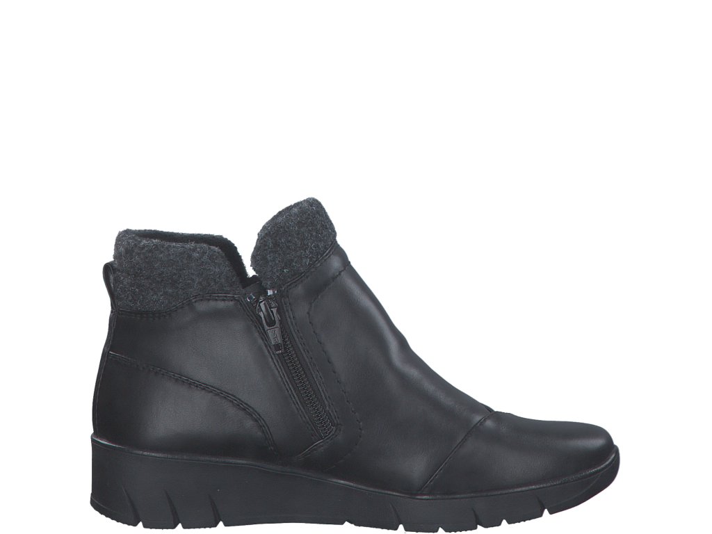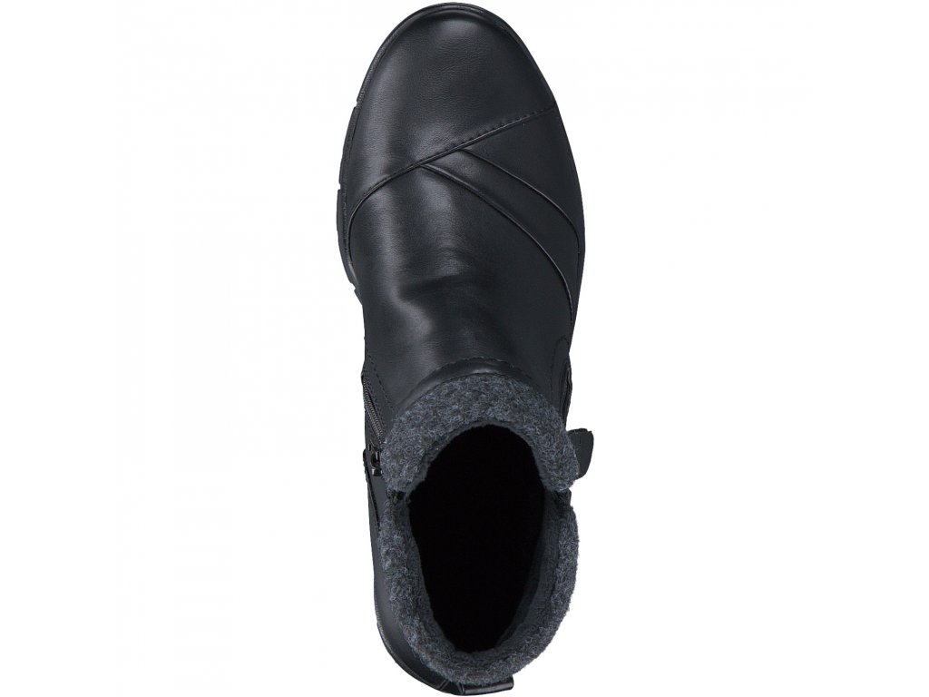 Dámské kotníčkové boty značky Jana. Model je vyroben z hladké z hladké černé syntetiky v černé barvě. Zadní část nad kotníkem je ozdobena měkkým límečkem z kvalitního filcového materiálu sytě šedé barvy. Po obou stranách nártu jsou všity funkční zipy. Vnitřek bot je zateplen krátkým textilním beránkem. Stélka je také zateplena a je vyměkčená. Velice pohodlná podešev na mírném klínku.
