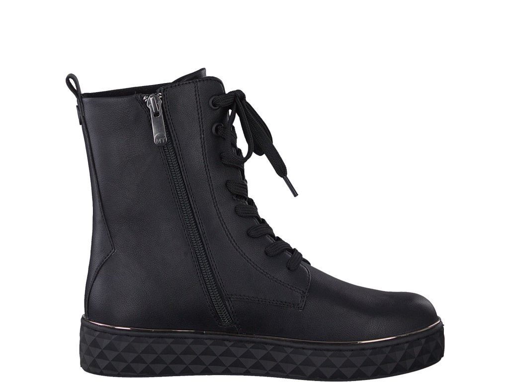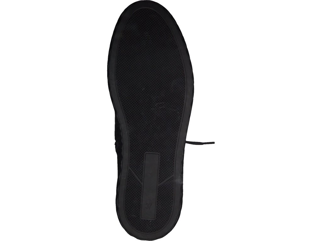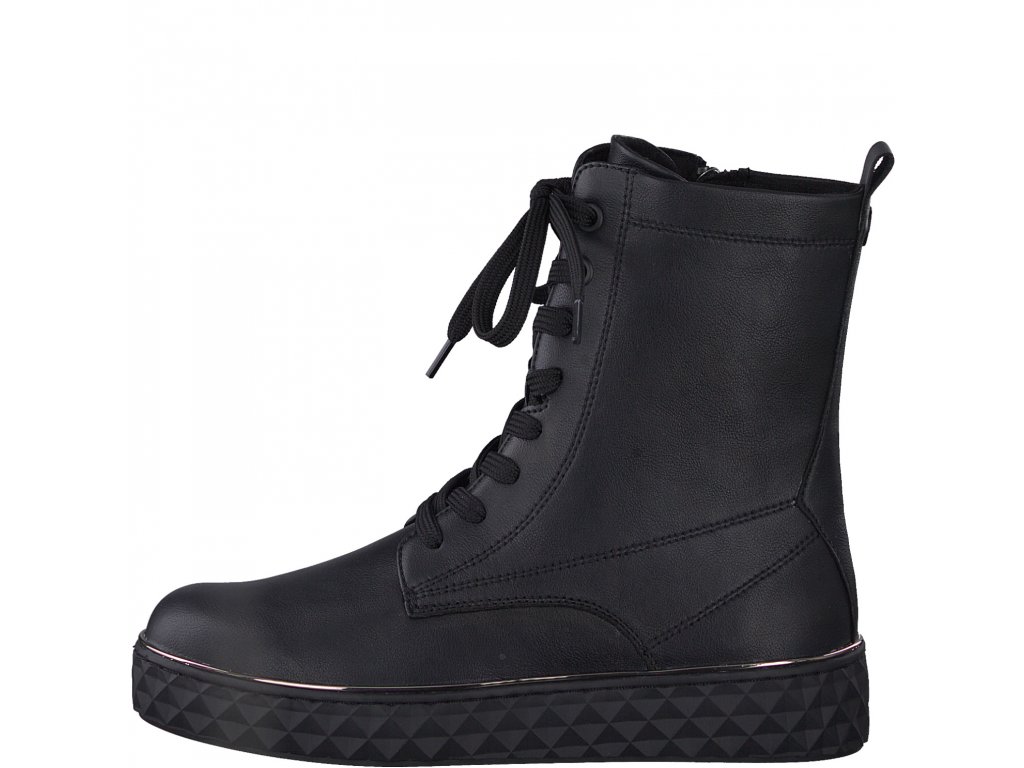 Dámské zimní boty značky Marco Tozzi. Polokozačky v hladkém černém provedení jsou posazeny na vyšší designovou podešev, která je od svršku oddělena jemným kovovým lemováním. I přes svou robustnost není podešev těžká. Vysoké šněrování je plně funkční, slouží ale hlavně k nastavení dle obvodu nohy. K pohodlnému obouvání plně stačí zip. Vnitřek je vyteplen semišem. Zateplena je také vyměkčená stélka.