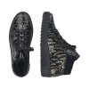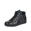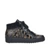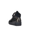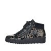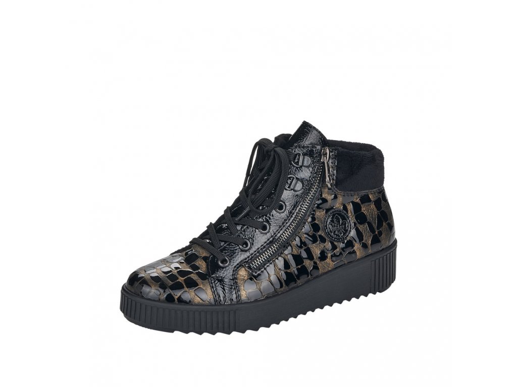 Dámské boty značky Rieker. Tento TOP model je vyroben z pravé kůže s lesklou povrchovou úpravou v černo-zlaté barvě. Nad kotníkem jsou zakončeny hřejivým límečkem. Tzv. teniskový střih velice podobný střihu bot jiného celosvětového výrobce pohodlné obuvi oblíbené hlavně u mladších ročníků spolu s důstojností značky Rieker vytváří tak boty pro jakoukoliv věkovou kategorii - prostě pro všechny, které mají rády šik a šmrnc. Šněrování je plně funkční, slouží hlavně k nastavení dle šíře nohy, k pohodlnému obouvání slouží hlavně zip. Vnitřek je vyteplen příjemně hřejivým textilním beránkem v černé barvě. zateplena je také stélka. POdešev s mírným klínkme a technologií Antistress.