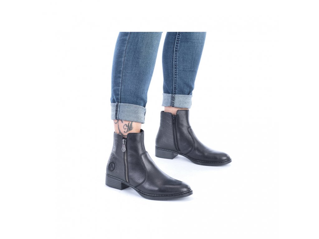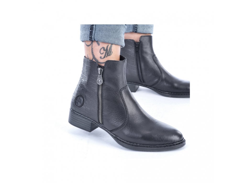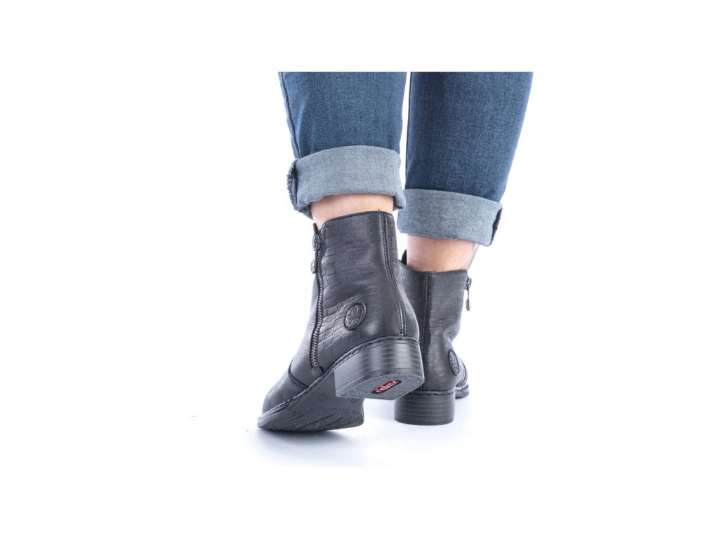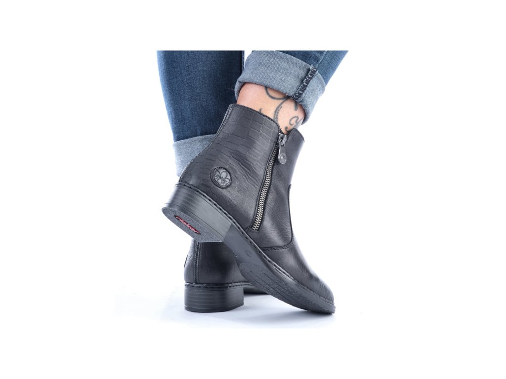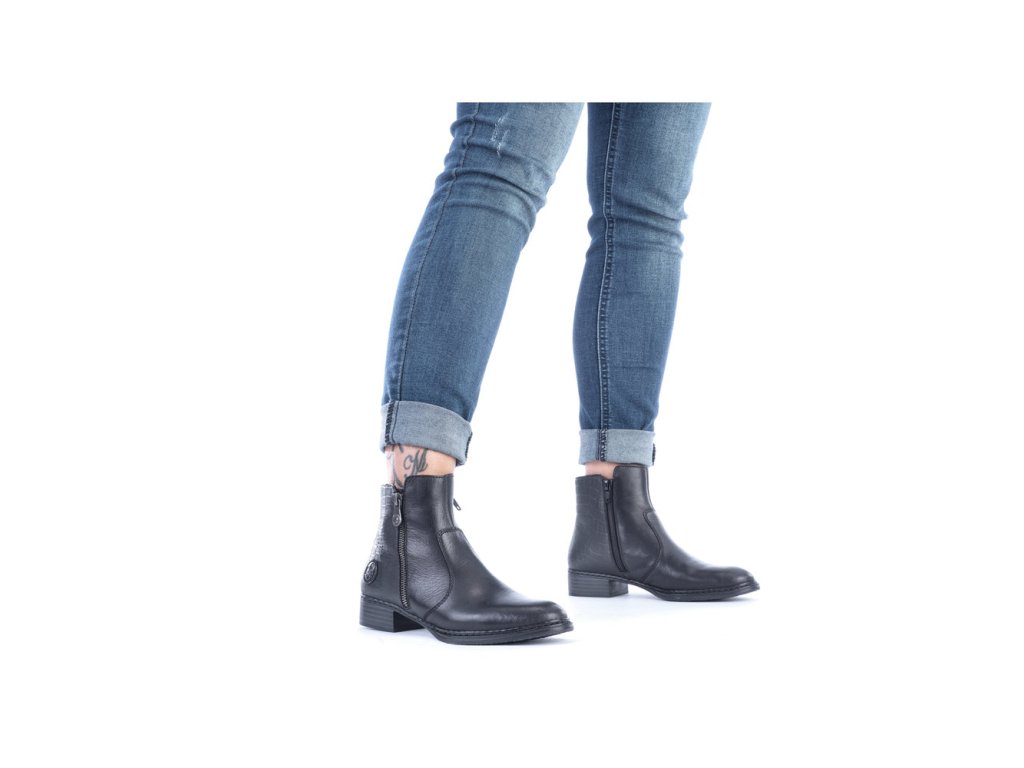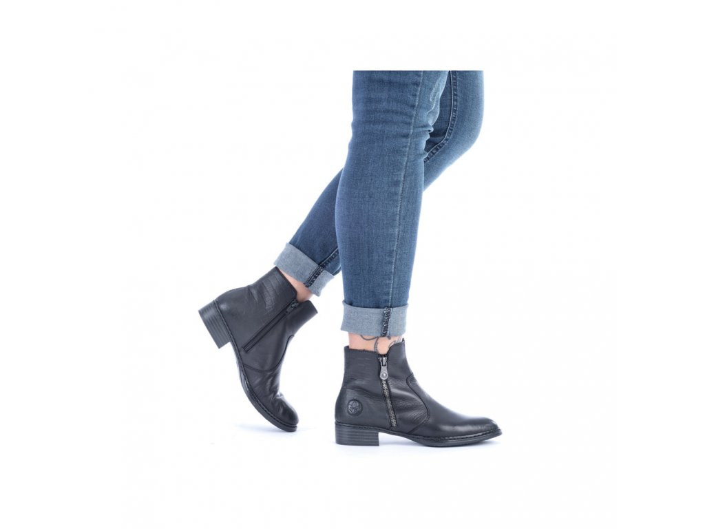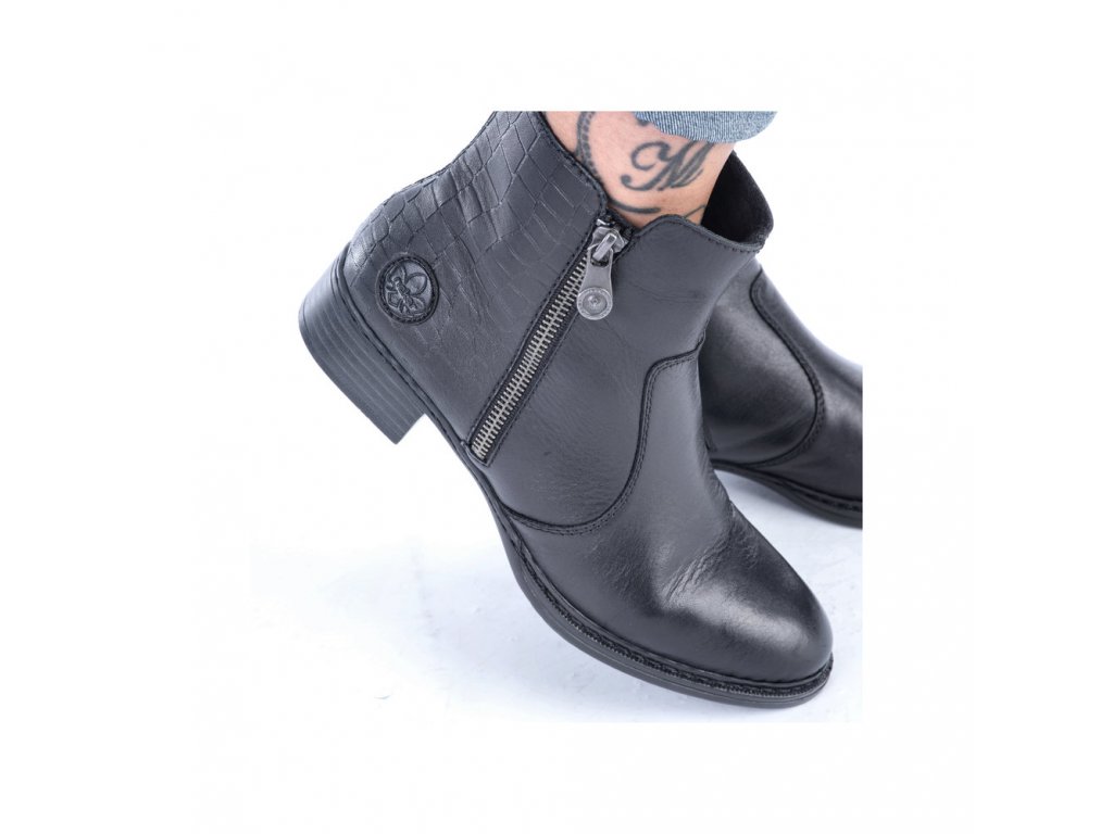 Dámské kotníčkové boty značky Rieker. Svršek je vyroben z pravé kůže. Kovový zip na vnější straně boty je designový prvek. Obouvání pomocí zipu na vnitřní straně. Kulatá špička a nízký podpatek předurčuje boty pro pohodlnou a bezstarostnou každodenní chůzi. Vnitřek je vyteplen fleece podšívkou, vyměkčená stélka flaušem.