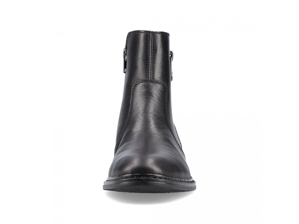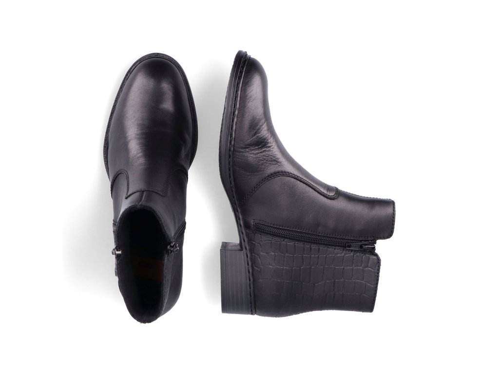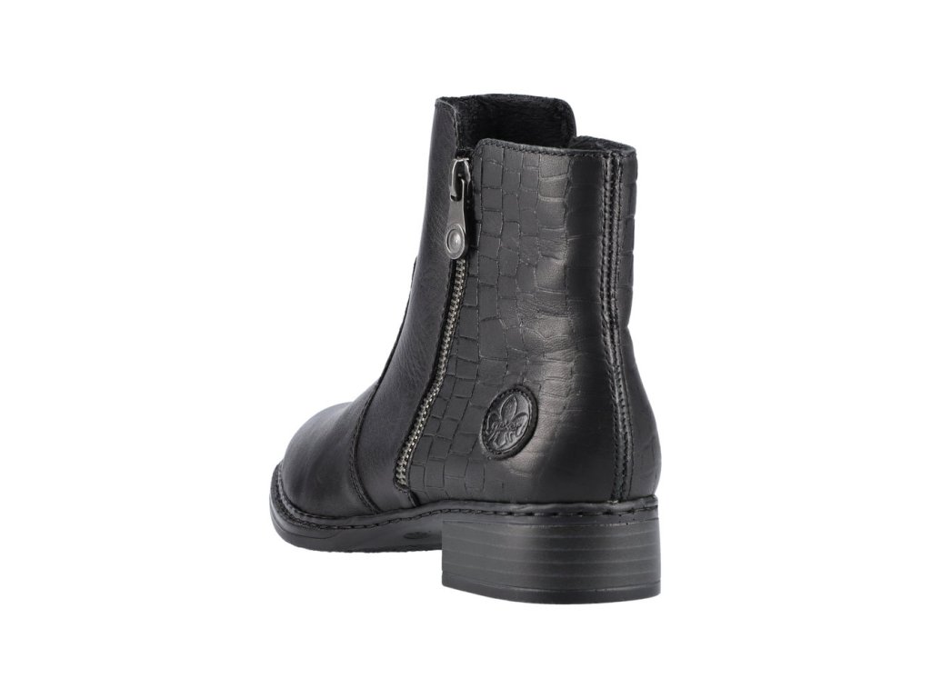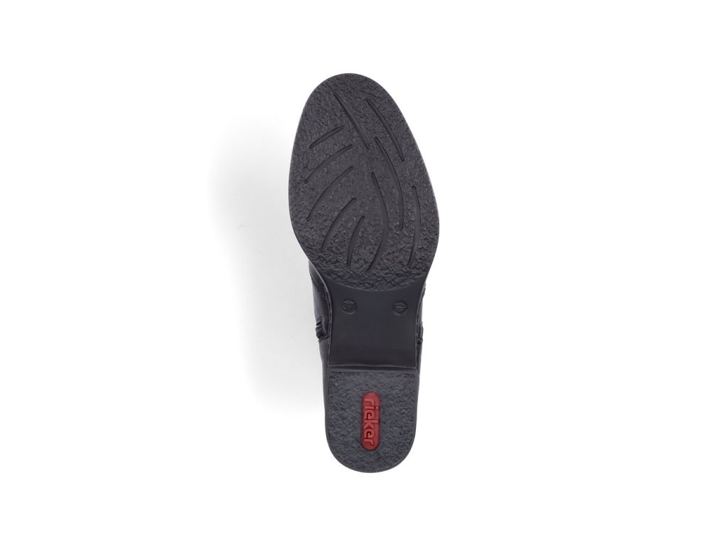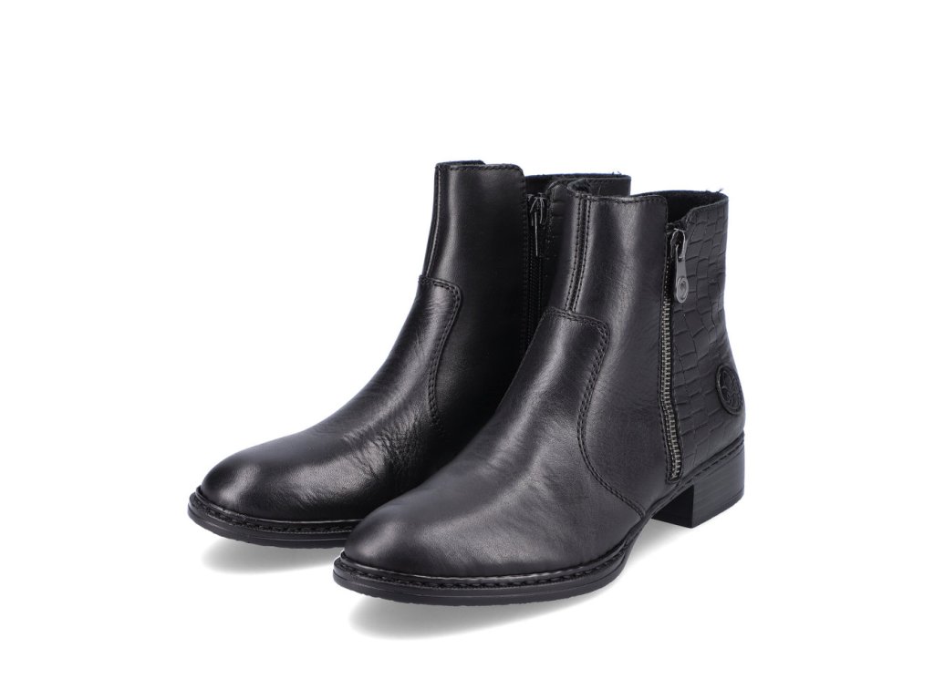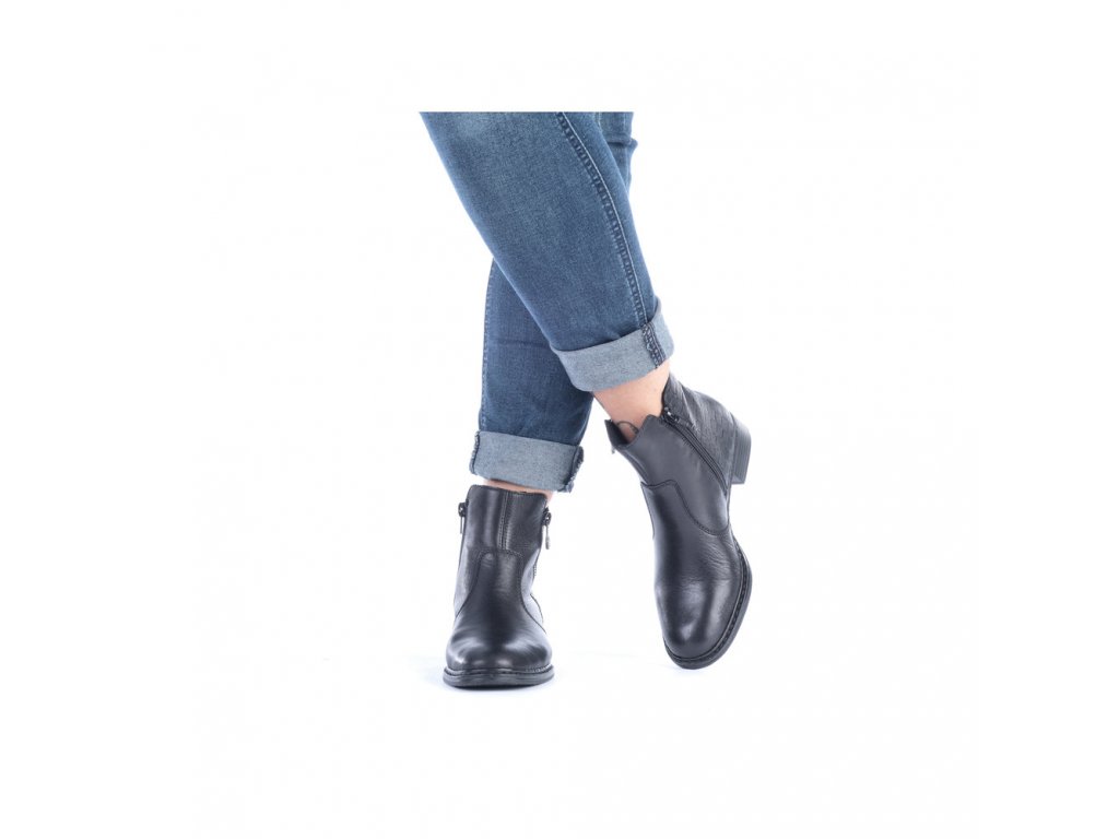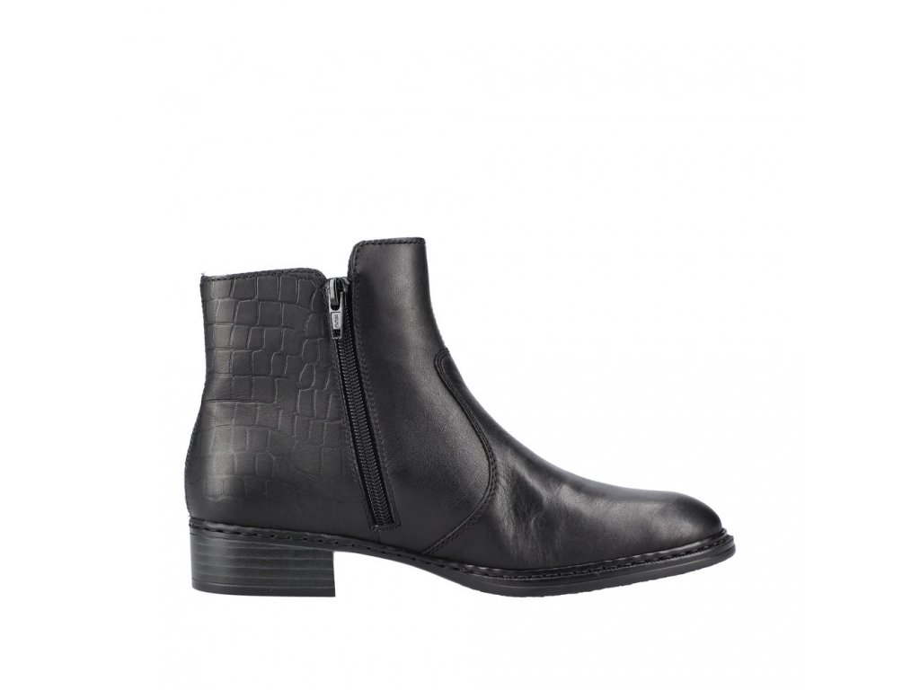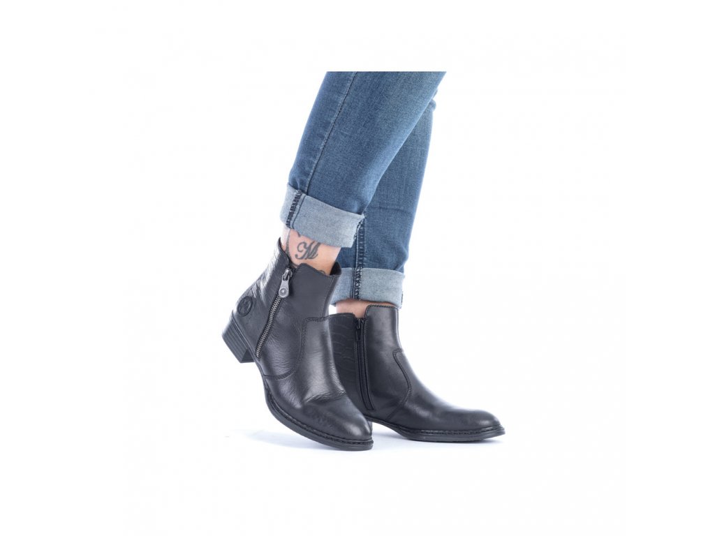 Dámské kotníčkové boty značky Rieker. Svršek je vyroben z pravé kůže. Kovový zip na vnější straně boty je designový prvek. Obouvání pomocí zipu na vnitřní straně. Kulatá špička a nízký podpatek předurčuje boty pro pohodlnou a bezstarostnou každodenní chůzi. Vnitřek je vyteplen fleece podšívkou, vyměkčená stélka flaušem.
