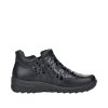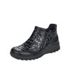 Dámské zimní polobotky značky Rieker. Svršek je vyroben v kombinaci kůže a syntetiky v černé barvě s veselým vzorem. Oba dva zipy jsou plně funkční, zajistí tak pohodlné obouvání. Vitřek je vyteplen textilním beránkem. Vyměkčená stélka je zateplena vysoce hřejivým flaušem. Bota je velice prostorná - přední část je kulatá. Vyšší podešev na mírném klínku ochrání svršek před nepříznivými zimními plískanicemi. Podešev je vybavena technologií Antistress.