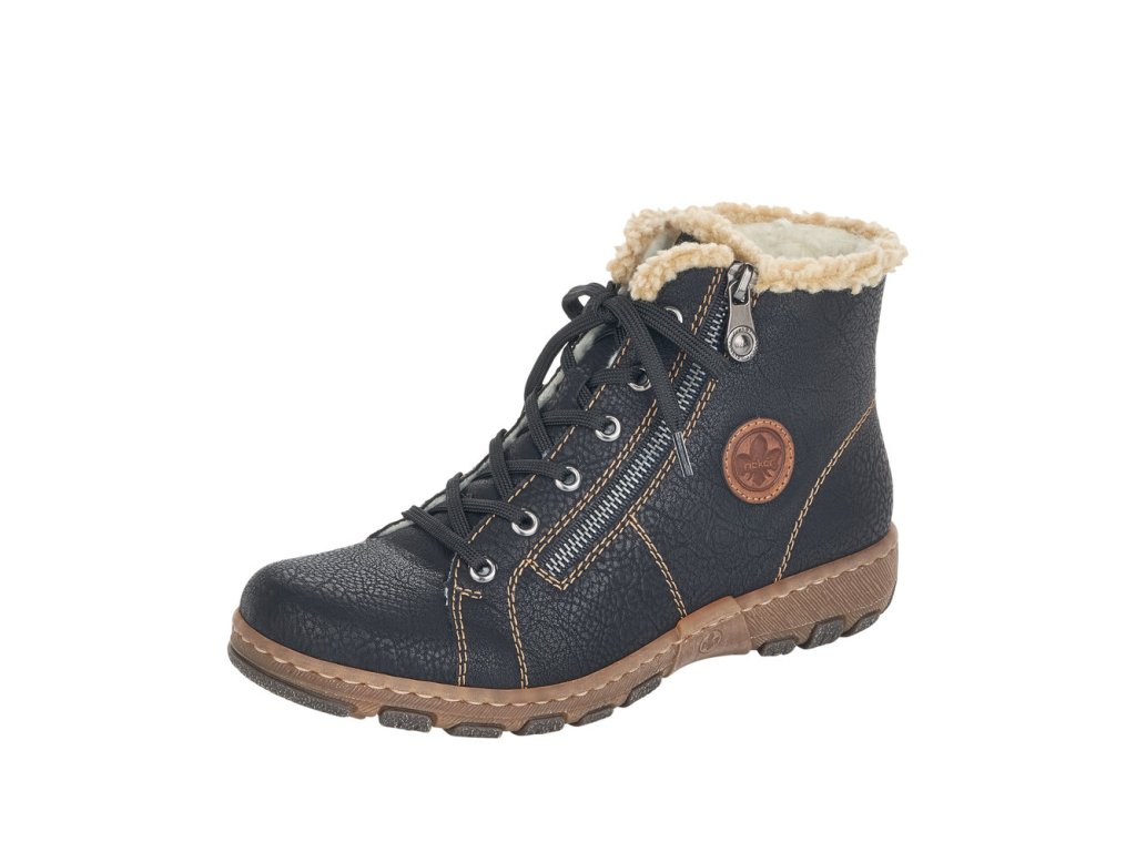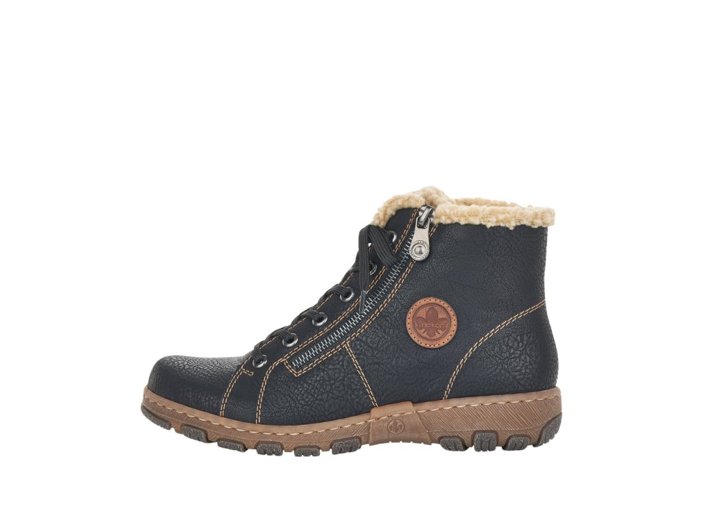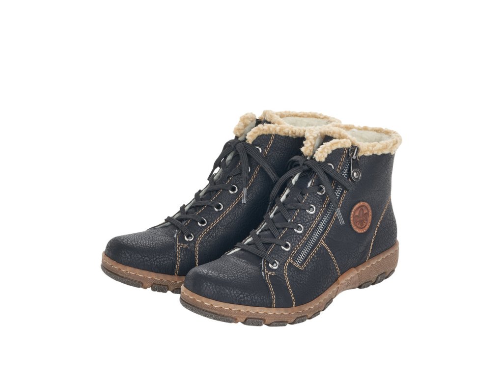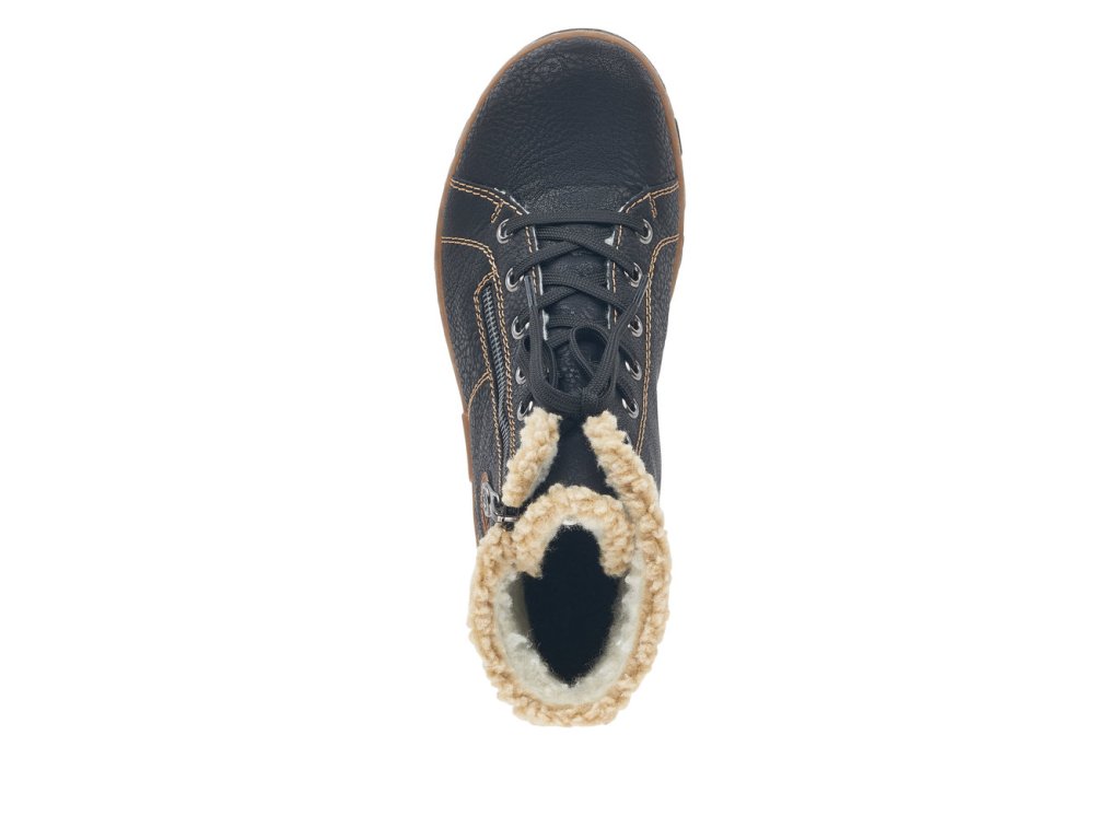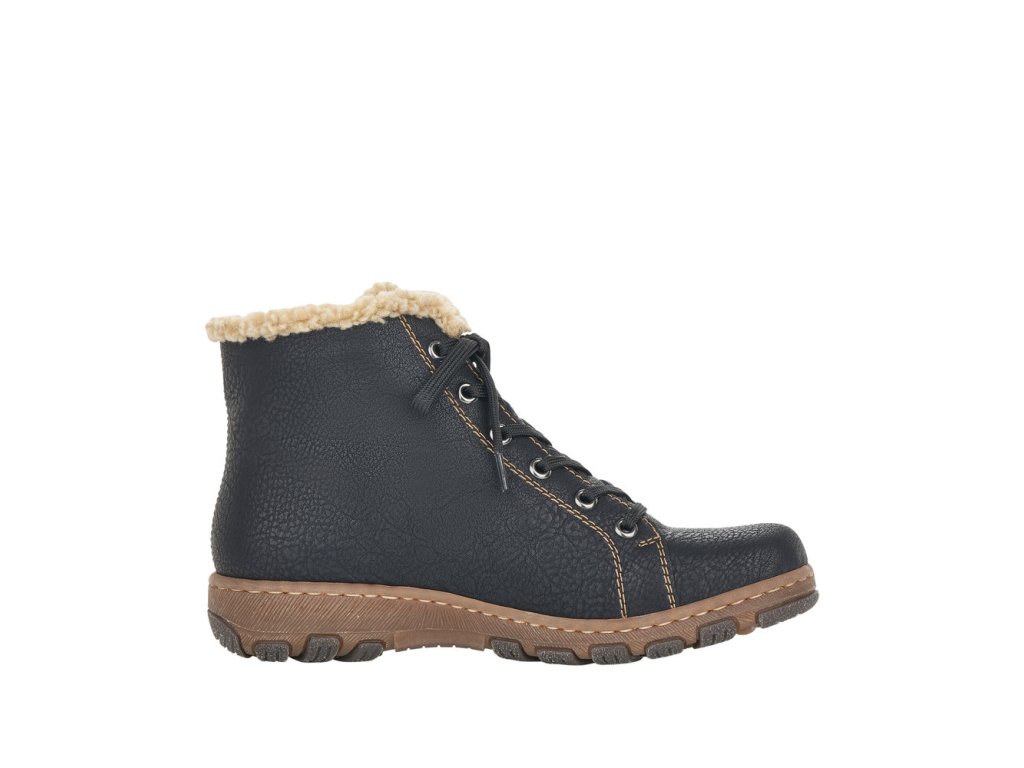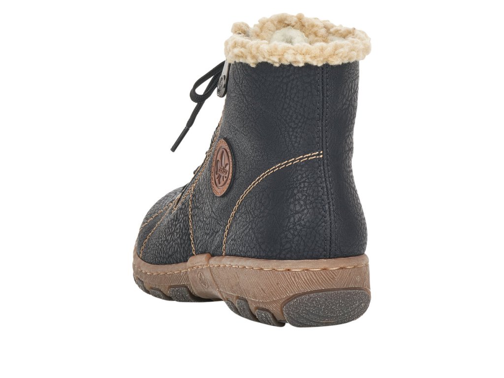 Dámské kotníkové zimní boty značky Rieker. Svršek je vyroben v imitaci matné kůže v černé barvě. Zdoben je přiznaným šitím, logem značky a jakoby vyčnívající vlněné podšívce, která vynikne hlavně na úzkých kalhotách. Šněrování i kovový zip jsou plně funkční. Hřejivá podšívka je vyrobena z textilního beránku, zateplena je také stélka. Hnědá podešev na nízkém klínku je vybavena techologií Antistress - flexibílní (ohebná) podešev tlumící rázy při chůzi. Současně je vyšší, čímž chrání svršek před vlhkostí ze spodu a nohy před chladem od spodu.