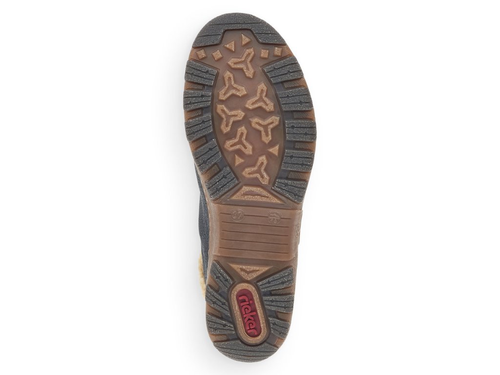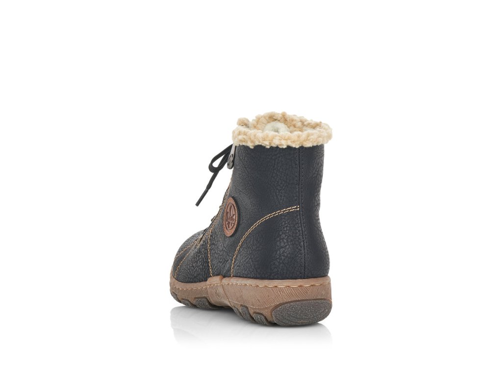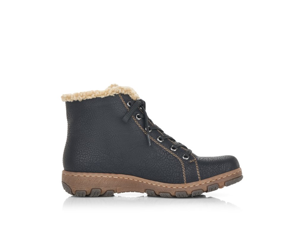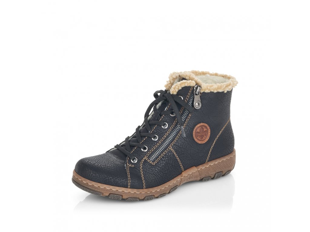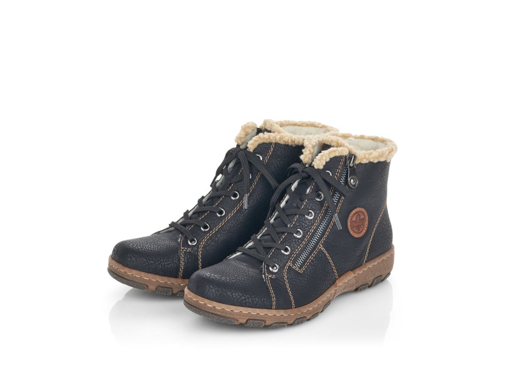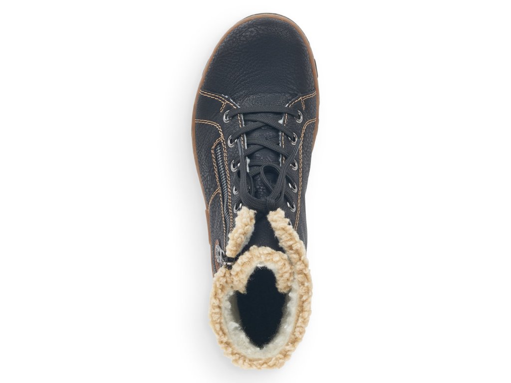 Dámské kotníkové zimní boty značky Rieker. Svršek je vyroben v imitaci matné kůže v černé barvě. Zdoben je přiznaným šitím, logem značky a jakoby vyčnívající vlněné podšívce, která vynikne hlavně na úzkých kalhotách. Šněrování i kovový zip jsou plně funkční. Hřejivá podšívka je vyrobena z textilního beránku, zateplena je také stélka. Hnědá podešev na nízkém klínku je vybavena techologií Antistress - flexibílní (ohebná) podešev tlumící rázy při chůzi. Současně je vyšší, čímž chrání svršek před vlhkostí ze spodu a nohy před chladem od spodu.