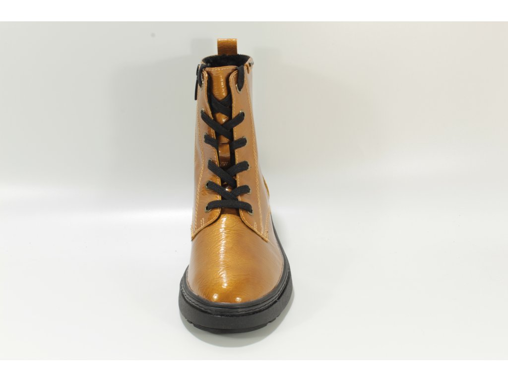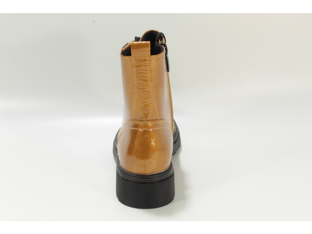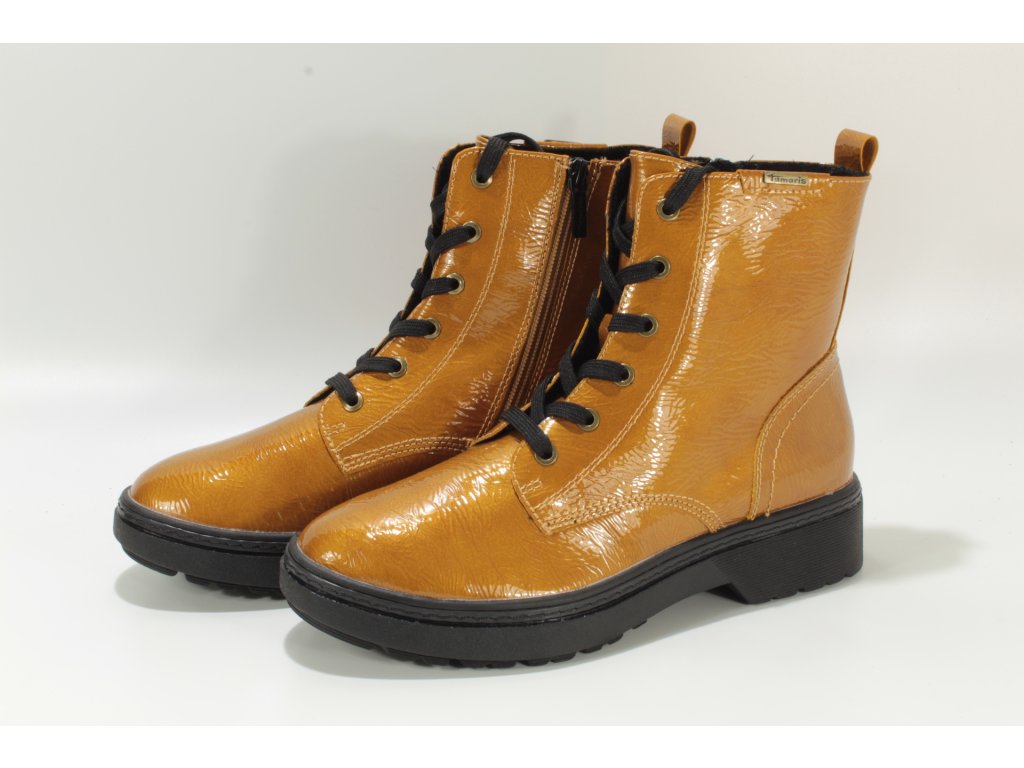 Dámské boty značky Tamaris. Svršek je vyroben v lesku v barvě hořčice a je ležérně nakrčen. Tento nevšední vzhled je doplněn tkaničkami a podešví v decentní černé barvě. Šněrování je plně funkční, slouží hlavně k nastavení dle obvodu a potřeb nohy. Ke snadnému obouvání slouží zip na vnitřní straně boty, který je ve stejné barvě jako svršek. Vnitřek je jemně vyteplen krátce střiženou fleece podšívkou. Zateplena je také měkká stélka. Vyšší podešev chrání svršek před nepřízní zimního ušmudlaného počasí a nohu před chladem tzv. "od spodu".