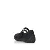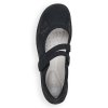 Dámské baleríny značky Rieker z jeho luxusní řady Remonte. Svršek je vyroben ze strečového textilu v černé barvě. Je tak poddajný a přizpůsobí se tvaru chodidla, nikde tak netlačí. Toto pohodlí je podpořeno také stélkou z paměťové pěny - systém Remonte Soft. Stélka je vyndávací. Pata a špičky jsou vyrobeny ze syntetiky v imitaci černé broušené kůže. Nohu fixuje nártní pásek za suchý zip. Samozřejmostí je flexibilní podešev s technologií Antistress.