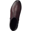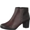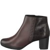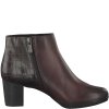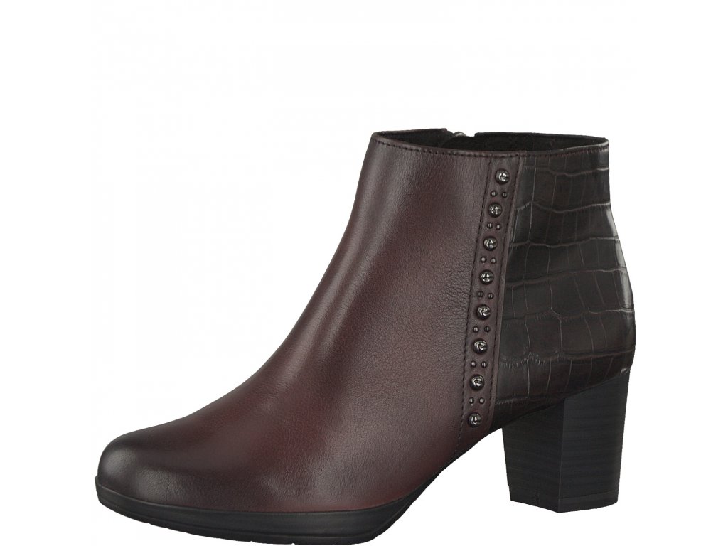 Dámské kotníčkové boty německé značky Marco Tozzi. Jemný model je vyroben z pravé hladké kůže v bordó barvě, která přechází v imitaci krokodýlí kůže. Místo přechodu je ozdobeno drobnými kovovými cvočky. Vnitřek obuvi je vyteplen textilním kožíškem. Zateplena je také stélka. Podpatek o výšce 6 cm.