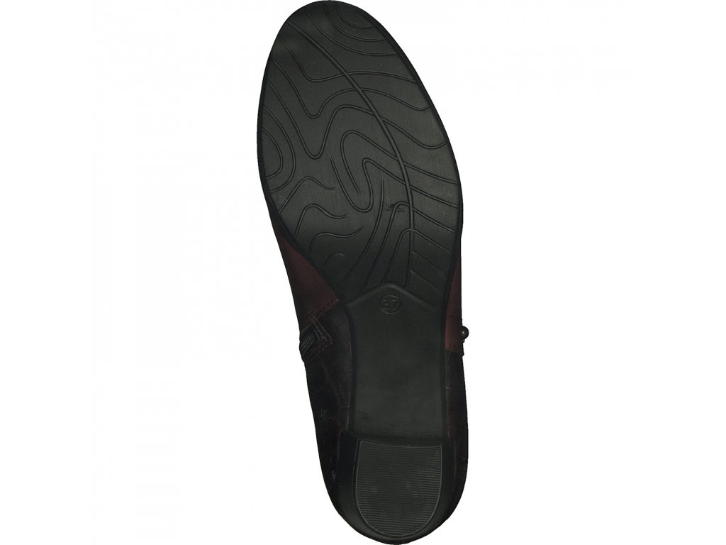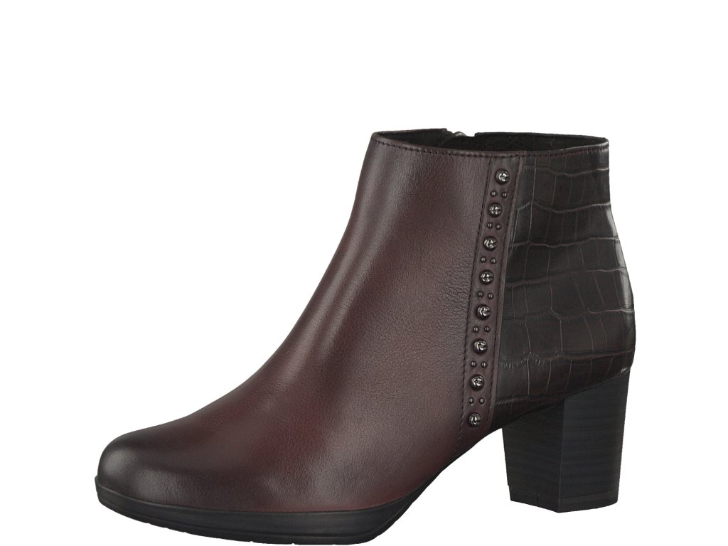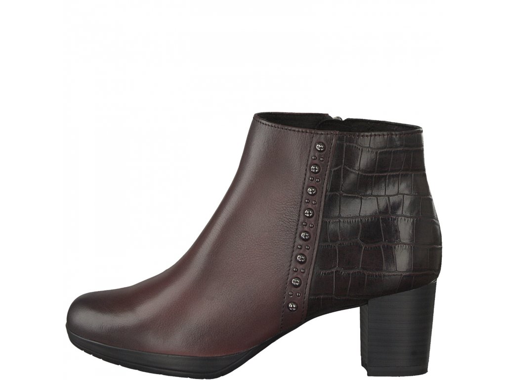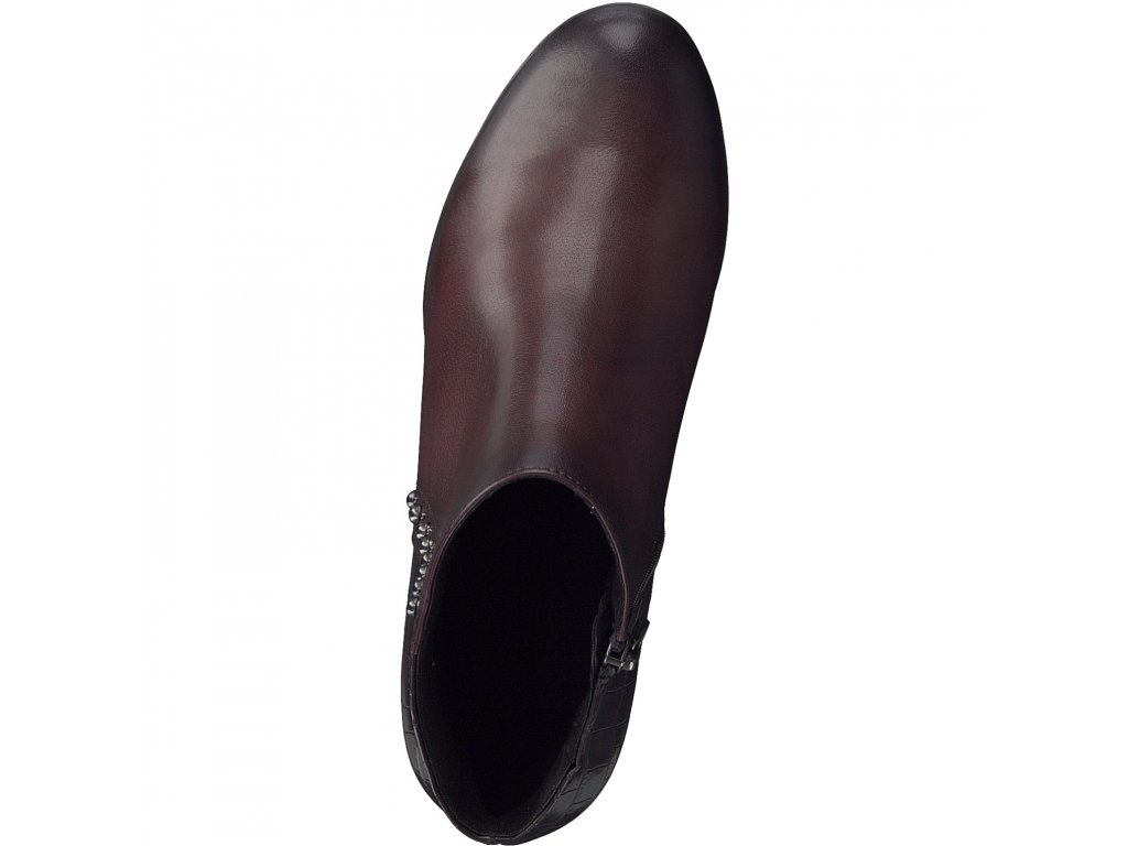 Dámské kotníčkové boty německé značky Marco Tozzi. Jemný model je vyroben z pravé hladké kůže v bordó barvě, která přechází v imitaci krokodýlí kůže. Místo přechodu je ozdobeno drobnými kovovými cvočky. Vnitřek obuvi je vyteplen textilním kožíškem. Zateplena je také stélka. Podpatek o výšce 6 cm.