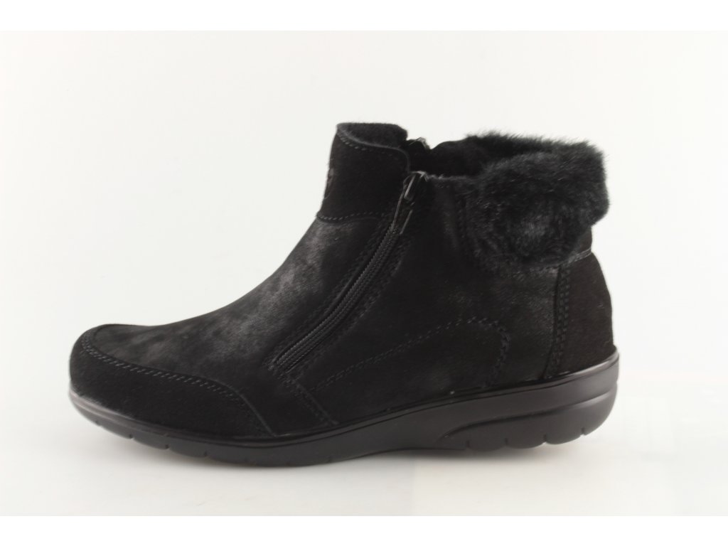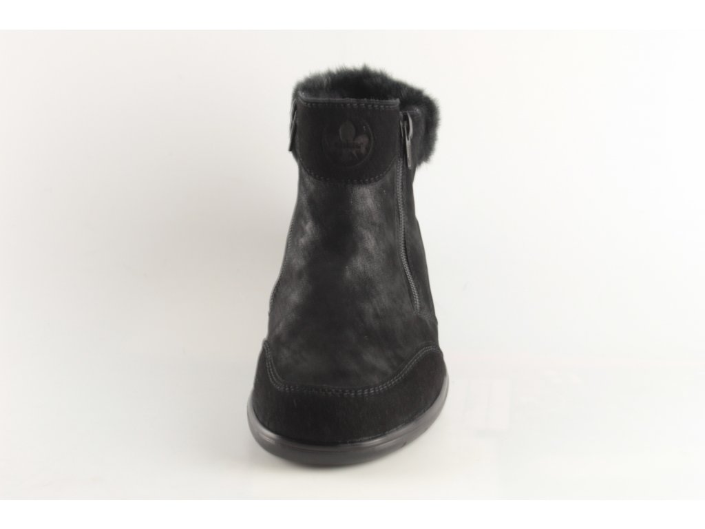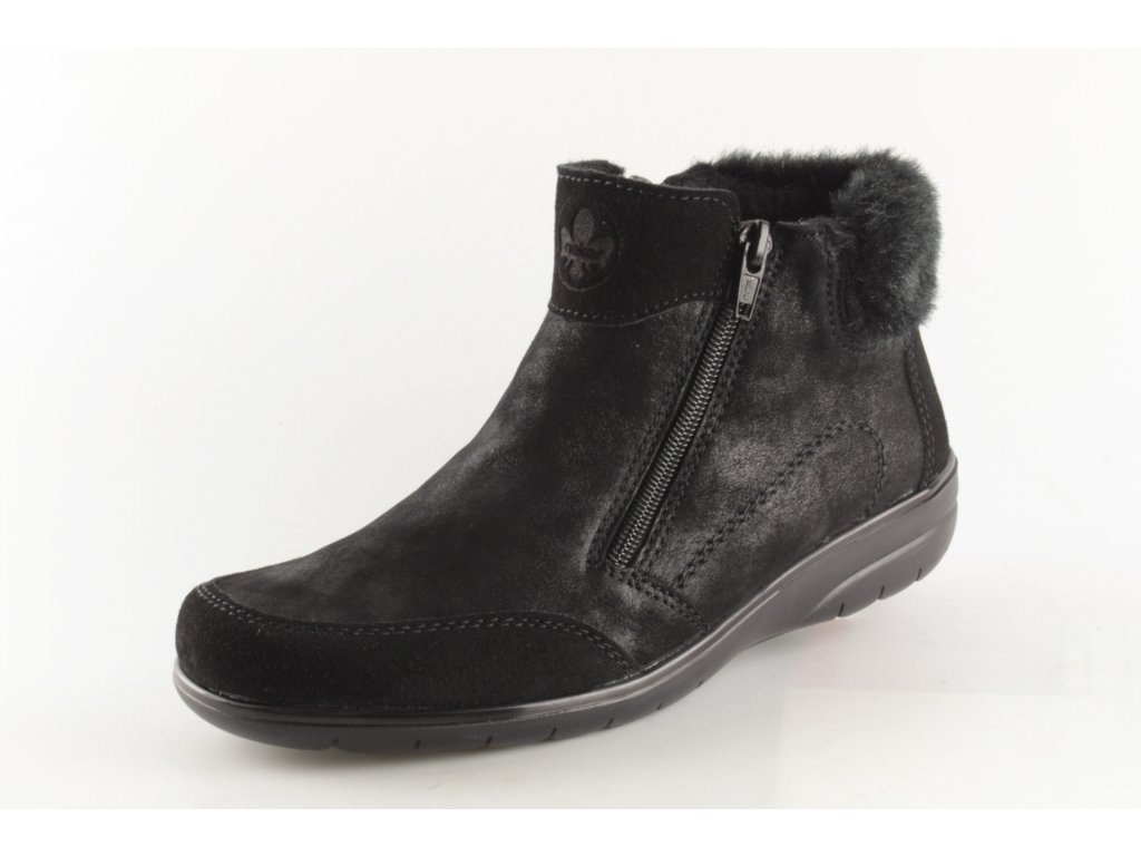 Dámské boty značky Rieker jsou vyrobeny v designu semiše. Příjemně měkký a hebký svršek je zakončen kožešinkovým límečkem. Velice snadné obouvání pomocí zipů na stranách nártu. Oba zipy jsou plně funkční. Vnitřek je zateplen textilním beránkem v černé barvě. Měkká stélka je zateplena flaušem. Kulatá špice poskytuje dostatek prostoru pro prsty a spolu s flexibilní podešví na nízkém klínku poskytnou nohám pohodlíčko při chůzi.