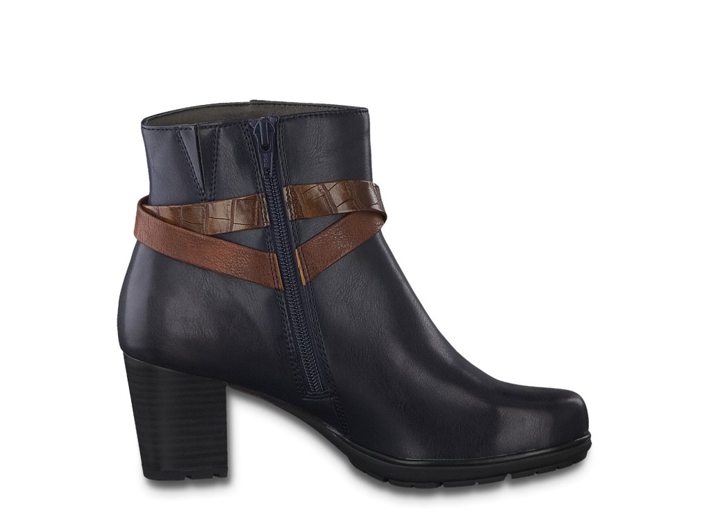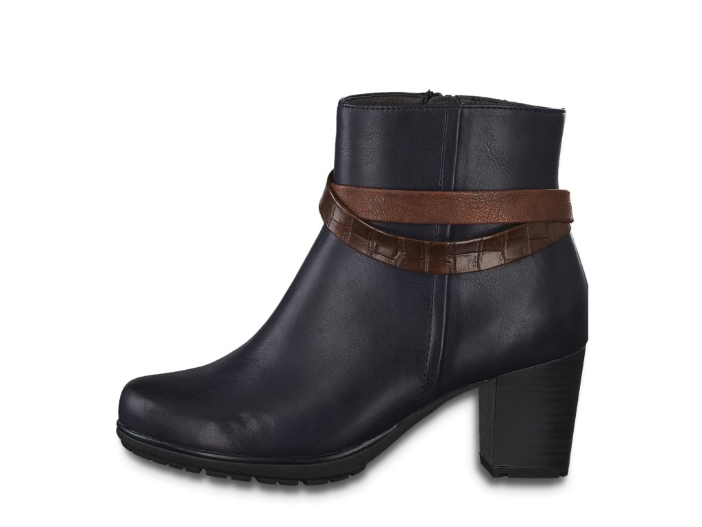 Dámské nízké kozačky značky Jana z jejich luxusní řady SOLF LINE. Obuv je ušita z hladké eko kůže v temně modré barvě, která je decentně ozdobena hnědými pásečky nad kotníkem. Zakulacená špice poskytuje dostatečný prostor prstům a záprstním kůstkám. Nízký střih - nad kotník tak není limitován šířkou lýtka. Vnitřek je vyteplen textilní podšívkou. Zateplena je také měkká paměťová stélka. Snadné obouvání pomocí zipu. Klasická podešev.