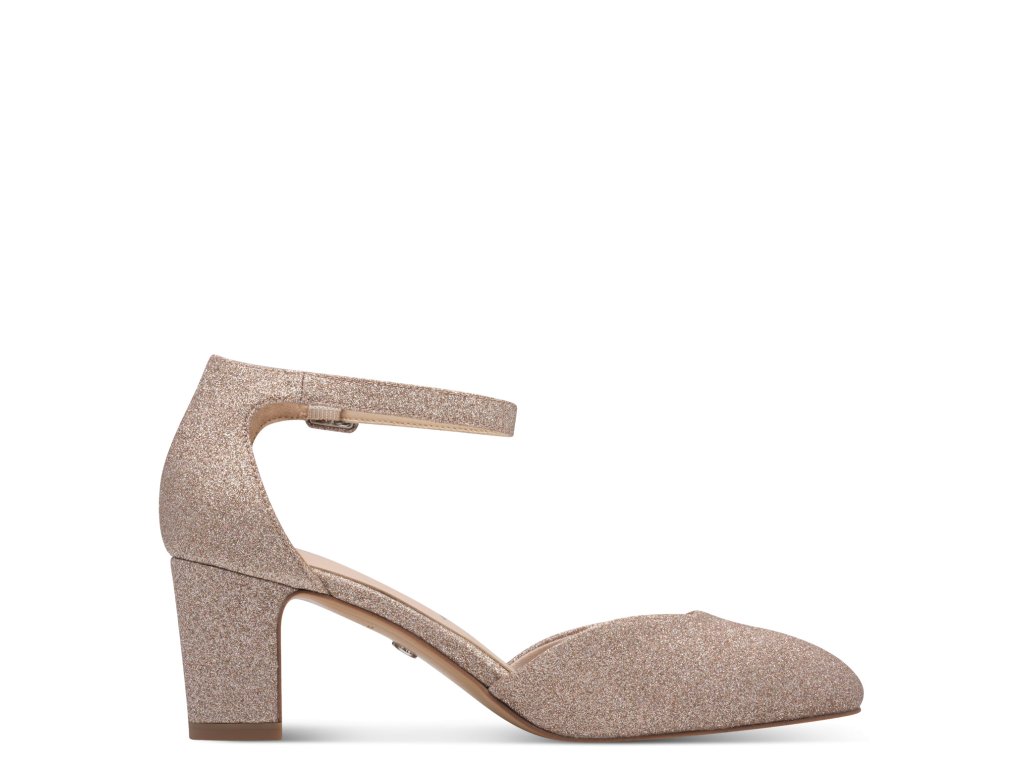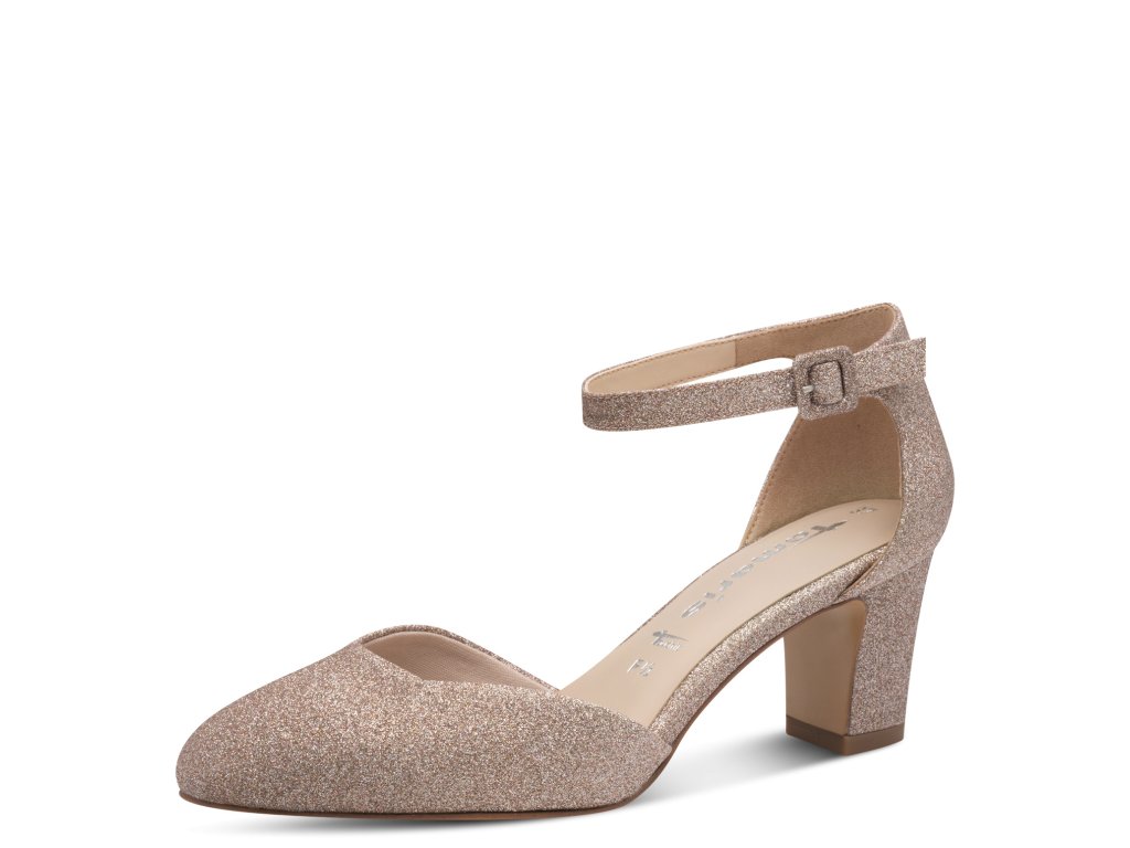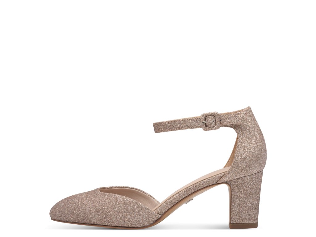 Dámské boty značky Tamaris jsou díky svému mírně třpytivému designu určené převážně pro společenské akce. Model je navržen tak, aby byl elegantní, ale také co nejvíce praktický a šetrný k nohám. Přední část je dostatečně prostorná, aby nesvírala nejvíce zatěžovanou část chodidla. Stélka je příjemně vyměkčená. Výška podpatku je střední, díky tomu tolik nezatěžuje klouby ani citlivé části chodidel. Podpatek je potažen stejným svrškovým materiálem ve stejné barvě - což opticky dělá podpatek vyšším, než je. Kotníkový pásek je pod zapínáním na sponu vybaven gumičkou, díky níž se při pohybu nezadírá do kůže, naopak kopíruje její pohyb.