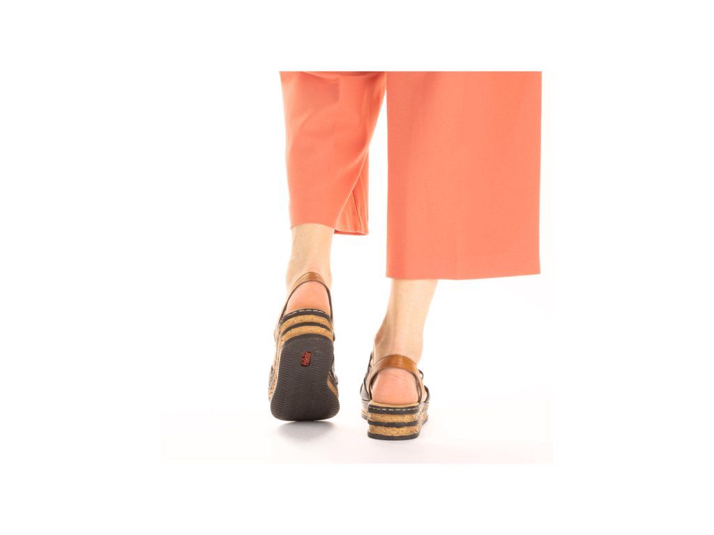 Dámské sandály na pohodlné platformě s kulatou přední částí. Měkký svršek skvěle zafixuje chodidlo, boční pružné pásečky kopírují pohyb chdidla při chůzi a díky tomu netlačí. Slouží také ke snadnému nazouvání. Stélka je vyměkčená a potažená semišovou textílií, která zabraňuje klouzání chodidla. Vyšší podešev v imitaci prokládaného korku je odlehčená a vybavena technologií Antistress - flexibilní podešev tlumící rázy při chůzi.