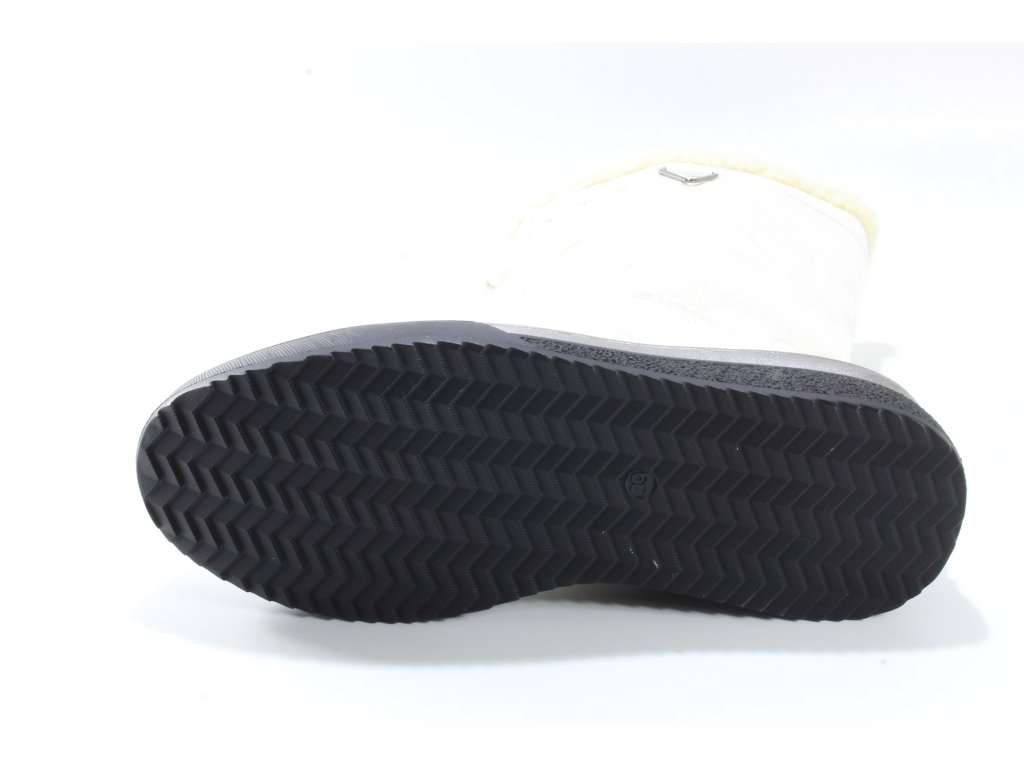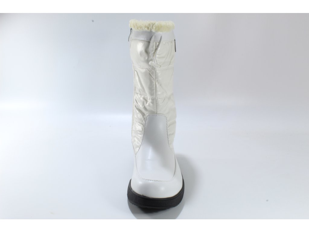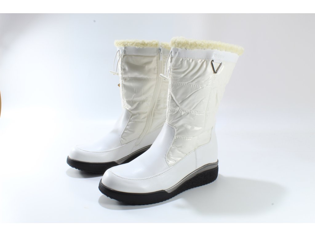 Elegantní dámské sněhule. Spodní část je hladká syntetika v imitaci kůže, horní lesklý textil. Vytepleno bílým textilním beránkem. Snadné obouvání pomocí zipu. Vyšší podešev na mírném klínku je designově doplněna šedým proužkem. Podrážka s hrubším vzorem proti uklouznutí.