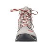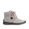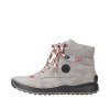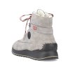 Dámské kotníčkové boty značky Rieker. Ležérní styl je vyroben v imitaci broušené kůže v šedé barvě a je doplněn výrazným šitím, pásečkem nad kotníkem a jemnými červenými stehy ve tvaru čtverečků. Tento styl skvěle doplňují karované tkaničky. Na vnější straně je logo značky. Snadné a rychlé obouvání pomocí zipu. Model má měkký ohebný svršek a lehkou podešev na mírném klínku. Podšívka je vyrobena z příjemně hřejivé střižní vlny. Stélka z paměťové pěny je vyteplena flaušem. Dynamicky řešená podešev je vybavena technologií Antistress - lehká flexibilní podešev - ideálně ohebná při chůzi a tlumící rázy při došlapu.