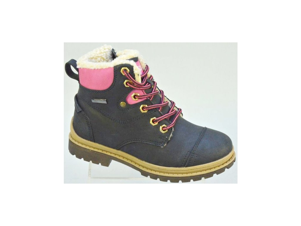 Dívčí zimní boty značky PEDDY. Jsou vyrobeny ze syntetické kůže ve stylu farmářek v barvě temně modré. Model je zjemněn růžovými tkaničkami a růžovým límečkem v oblasti kotníku. Vytepleny jsou textilním chlupem. Obouvání pomocí zipu na vnitřní straně boty. Šněrování slouží k nastavení dle šíře dětské kožky. Vyšší podešev.
