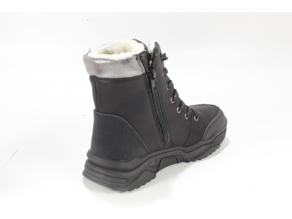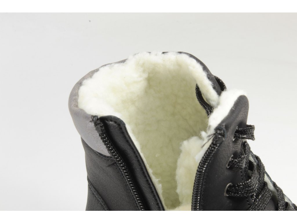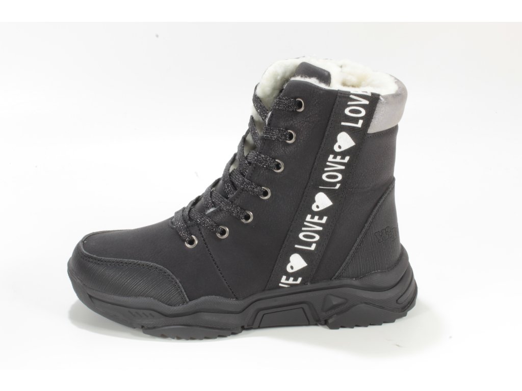 Dívčí zimní boty jsou vyrobeny v imitaci černé hladké kůže, snadno se tak udržují. Zdobené jsou krásnou nášivkou přes kotník, kovově- stříbrným límcem v horní části bot a zdobnými tkaničkami. Ty slouží hlavně k nastavení dle obvodu dané nohy, ke snadnému obouvání slouží hlavně zip. Přední část - špička a pata je navíc přetažena pevnějšími dílci, které chrání boty proti okopu. Vnitřek je vyteplen heboučkou umělou kožešinkou a to včetně stélky. Vyšší podešev chrání nohy od chladu ze spodu a boty před mokrým zimním počasím.