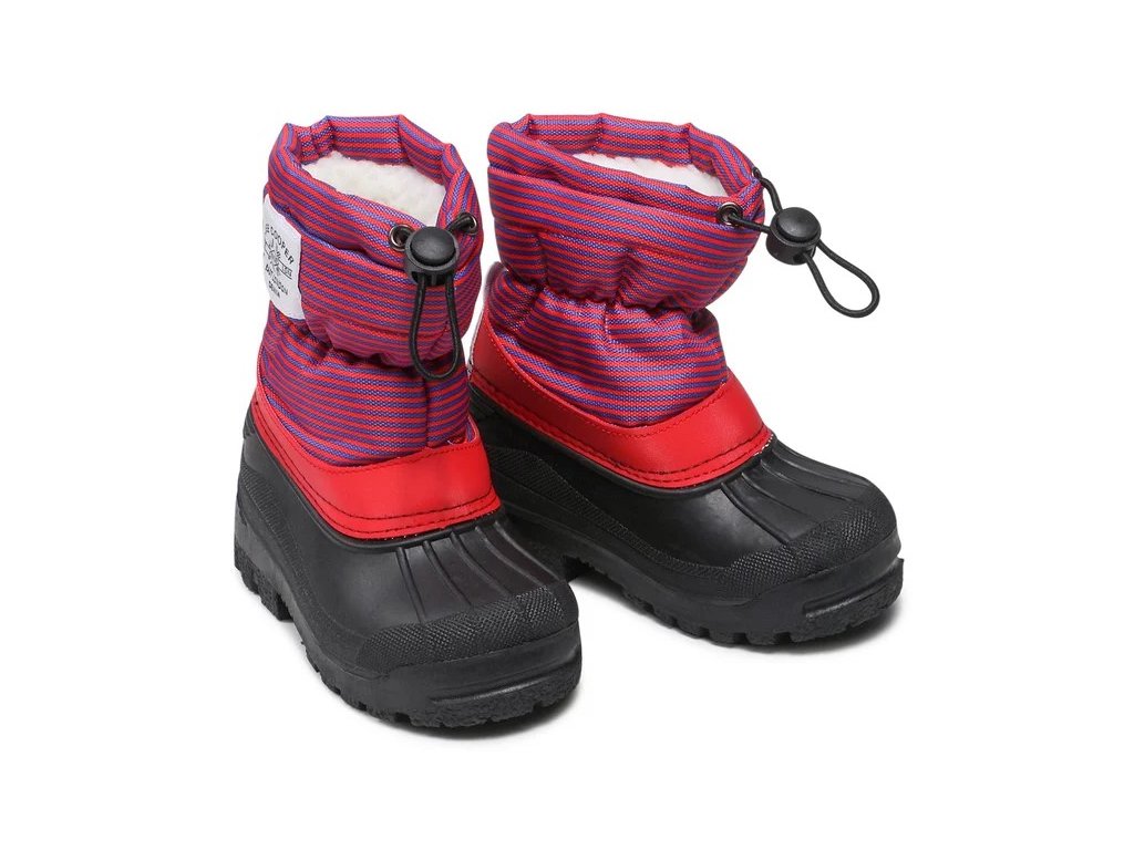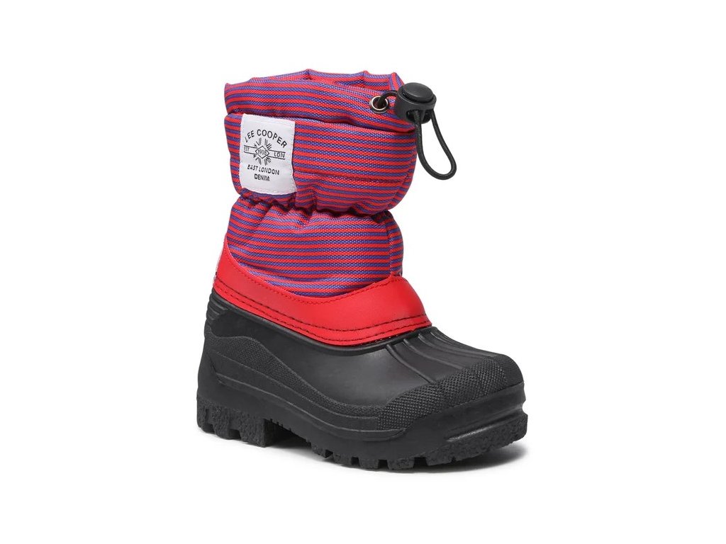 Dětské sněhulky značky Lee COOPER mají spodní část vyrobenou z nepromokavého gumového materiálu, který tvoří s podešví monolit. Materiál navíc zabraňuje uklouznutí, v čemž ho podporuje i výrazný vzorek podešve. Horní část svršku je z hrubého textilu. Díky tomu je velice ohebný, ale zároveň drží tvar. Nožka tak do botiček vklouzne bez potíží. Část přechodu mezi spodní částí s svrškem je navíc přešila červeným syntetickým páskem, čímž je chráněna proti vlhku. Vnitřek je vyteplen včetně stélky teploučkou textilní vlnou. Horní tkanička je pružná a snadno nastavitelná díky olivce.