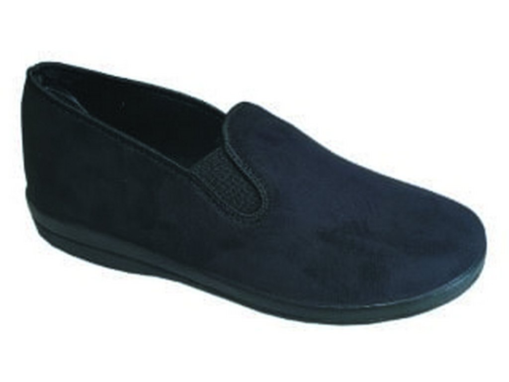 Pánské pantofle značky Adanex se vyznačují svým "festovním" střihem a vysoce kvalitními materiály. Svršek je vyroben z pevného, krátko střiženého stálotvarého semiše v temně modré barvě. Lehká podešev s anatomickou výškou klínku je neznačkující (nedělá šmouhy).