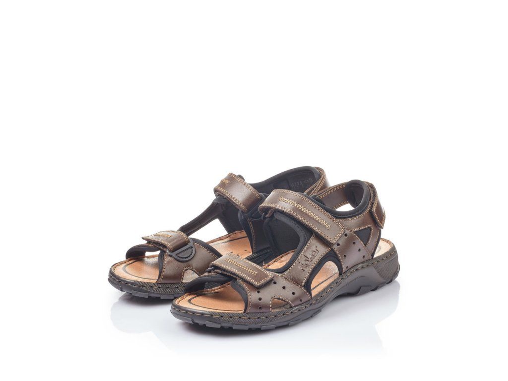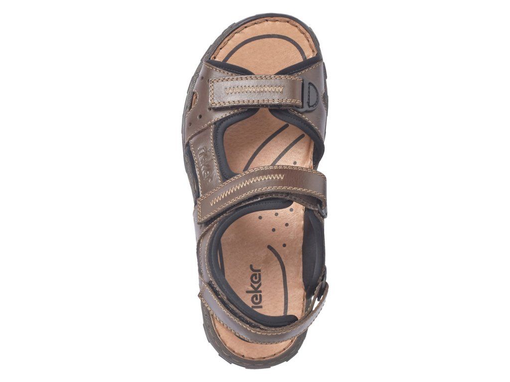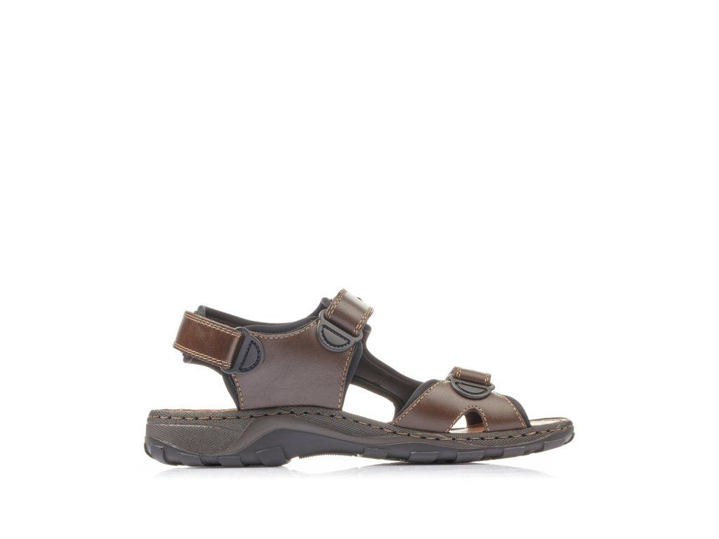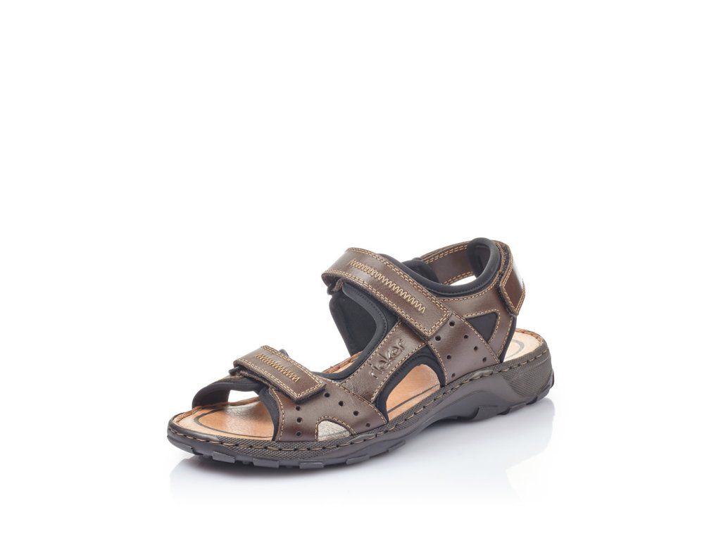 Pánská sandálová obuv značky RIEKER. Tyto sandály patří mezi tradičně nejoblíbenější vzor pohodlné vycházkové a sportovní obuvi této značky. Pásky jsou ušity z pravé kůže a podšité elastickou textílií. Fixace kotníku spolu s nártním páskem jsou regulovatelné pomocí suchého zipu. Obuv je vybavena vyměkčenou stélkou a flexibilní podešví se systémem Antistress. Díky použitým materiálům a technologiím je model vysoce variabilní - vhodný jak pro každodenní nošení tak pro turistiku na měkčích i tvrdších površích.