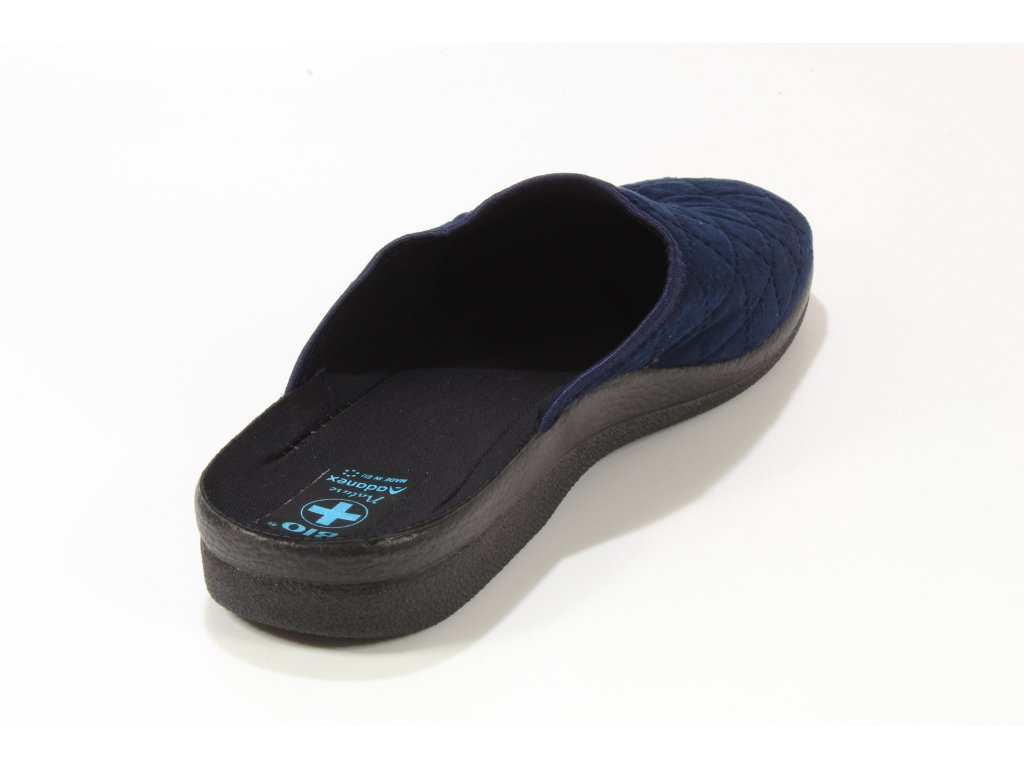 Pánské pantofle s uzavřenou špičkou od tradičního výrobce domácí obuvi Adanex. Příjemně teploučký svrchní materiál stálo tvarový v temně modré barvě. Stélka je ušita z textilního materiálu. Lehká polyuretanová podešev tlumí došlap a nezanechává šmouhy.