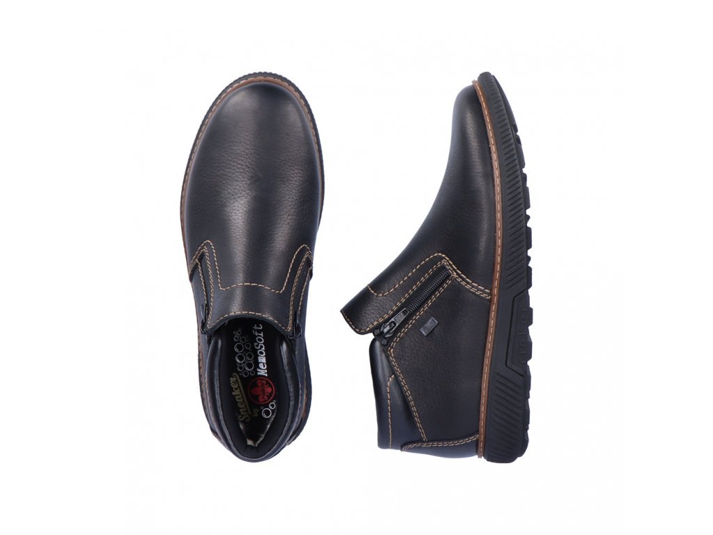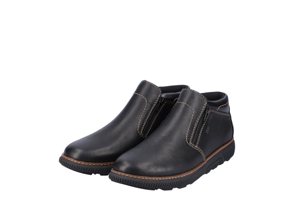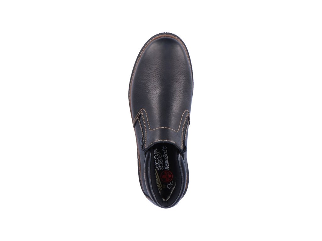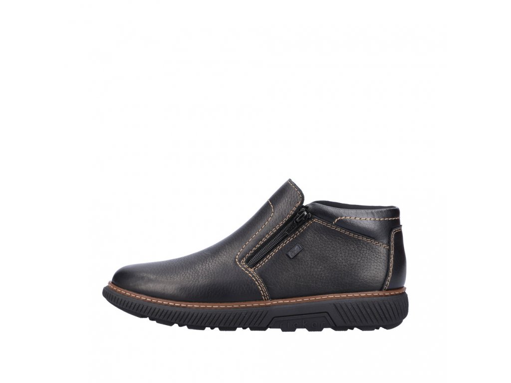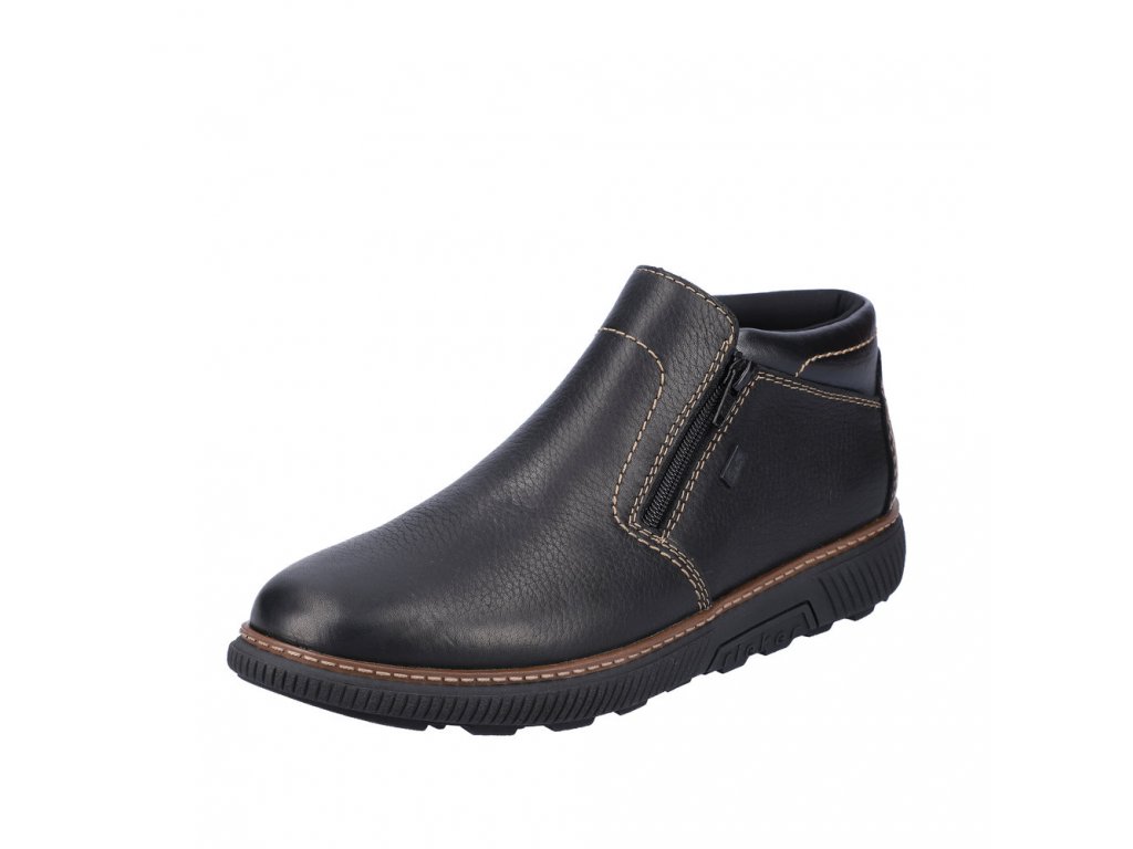 Pánské zimní kotníčkové boty Rieker s prostornou kulatou přední částí. Svršek je vyroben z pravé kůže. Snadné obouvání pomocí dvou funkčních zipů na nártu. Vnitřek je vyteplen pravou ovčí vlnou. Zateplena je také stélka s technologií Memo Soft - vyměkčená stélka z paměťové pěny. Obuv je vybavena Rieker TEX membránou, která chrání obuv svršek proti vodě, zároveň vytváří uvnitř bot optimální klima - odvádí ven přebytečné teplo. Zabraňuje tak pocení nohou a prodlužuje životnost bot. Podešev je flexibilní s technologií Antistress.