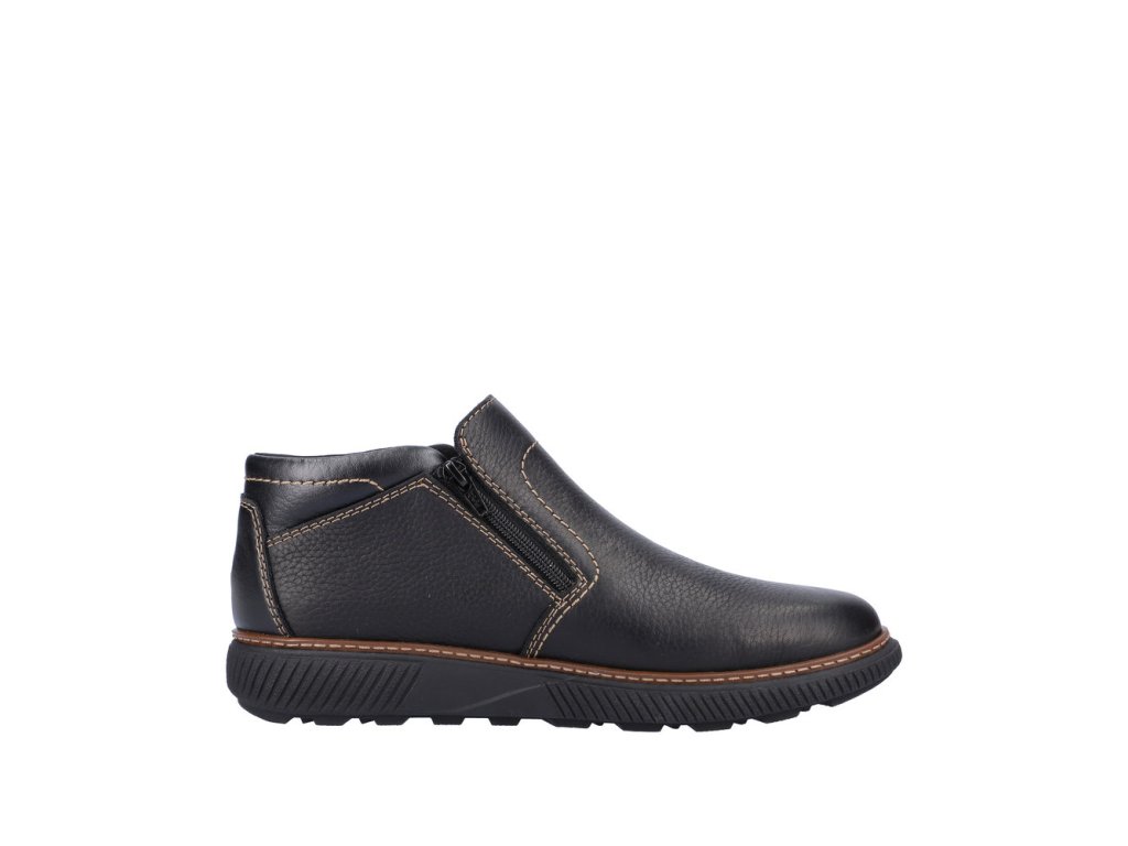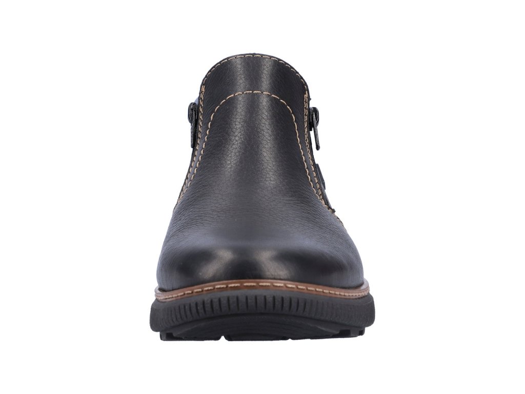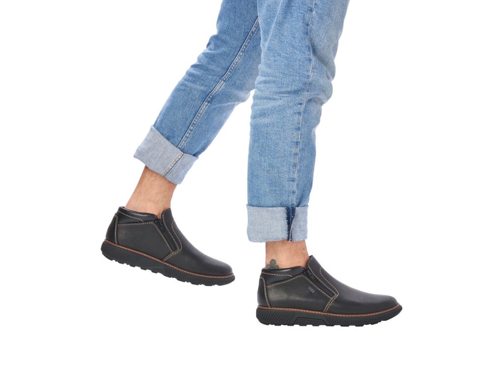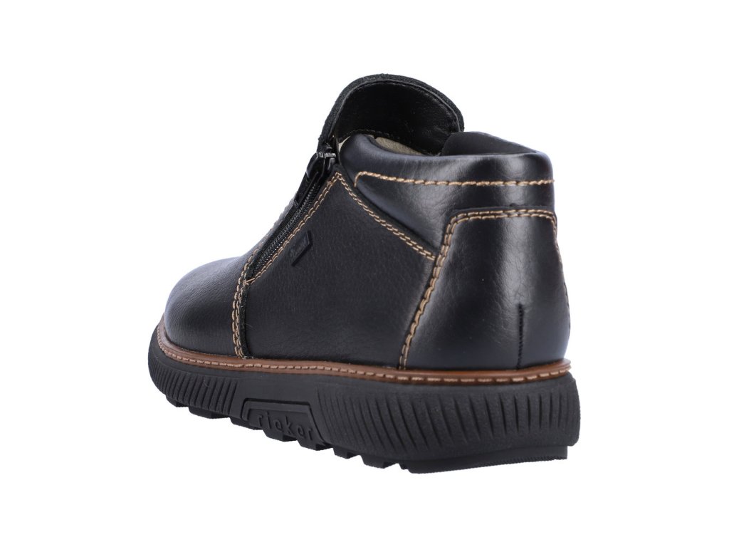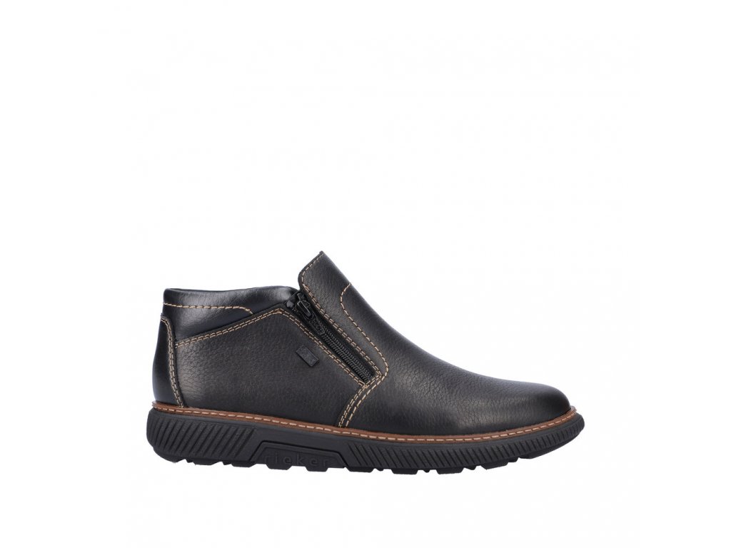 Pánské zimní kotníčkové boty Rieker s prostornou kulatou přední částí. Svršek je vyroben z pravé kůže. Snadné obouvání pomocí dvou funkčních zipů na nártu. Vnitřek je vyteplen pravou ovčí vlnou. Zateplena je také stélka s technologií Memo Soft - vyměkčená stélka z paměťové pěny. Obuv je vybavena Rieker TEX membránou, která chrání obuv svršek proti vodě, zároveň vytváří uvnitř bot optimální klima - odvádí ven přebytečné teplo. Zabraňuje tak pocení nohou a prodlužuje životnost bot. Podešev je flexibilní s technologií Antistress.