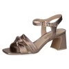 Dámské sandály značky Caprice v kovově měděné barvě s mírným leskem (barva na fotce odpovídá skutečnosti). Nártní pásky jsou oboustranné, velice příjemné je dotek (jako měkká kůže) a zdobně přepásané. Díky " H " tvaru skvěle obepnou chodidlo a přitom se přizpůsobí pohybu při chůzi. Navíc skvěle na na noze vypadají. Kotníkový pásek s klasickou kovovou sponou a možností nastavení dle daného obvodu. Podešev po obvodu i podpatek je vyhotoven ve stejné barvě jako svršek, což dodává botám glanc a jsou vhodné nejen pro krásné letní dny, ale také během celého roku pro různé společenské a slavnostní příležitosti. Podpatek je široký, bytelný a elegantně tvarovaný.