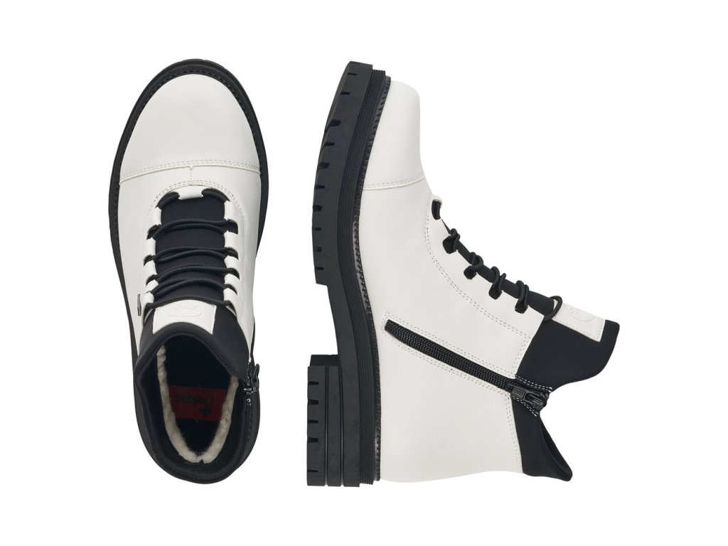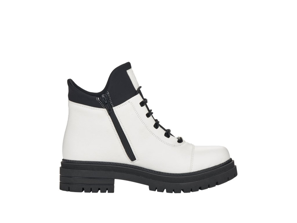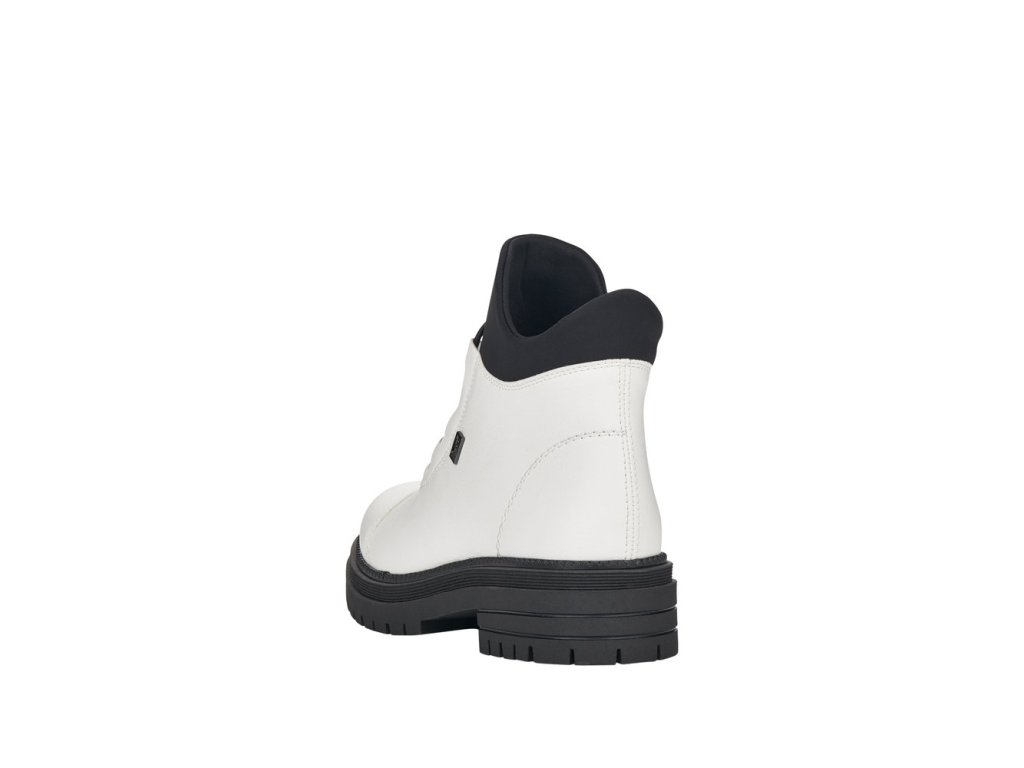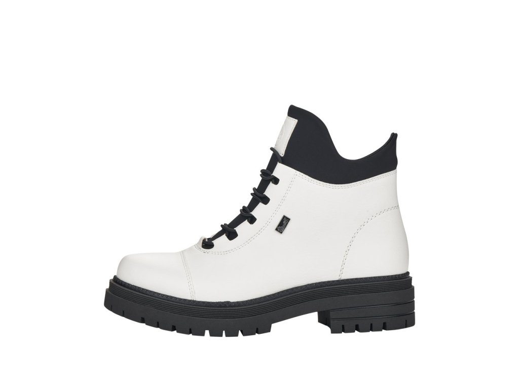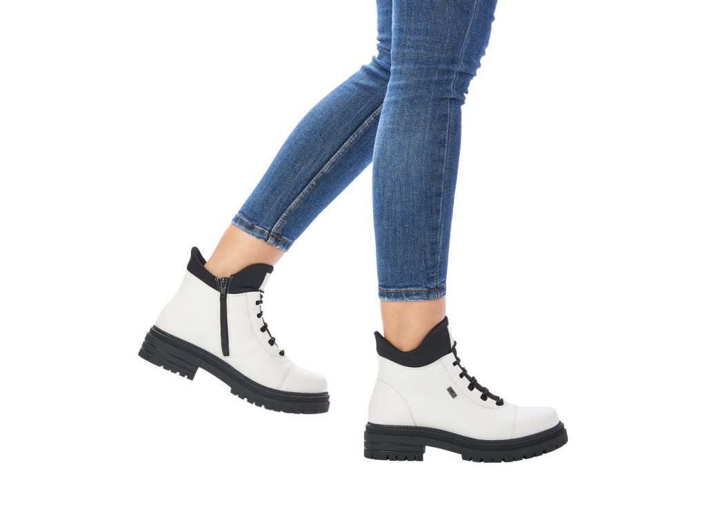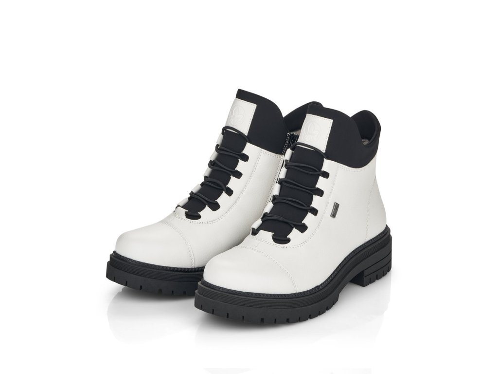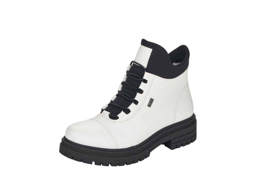 Dámské zimní boty značky Rieker. Tento model v dominanci béžové barvy doplněné černými komponenty zaujme na první pohled svou odlišností od klasiky. Částečně elastický jazyk ze softsheele materiálu přechází v límec v horní části boty. Je příjemně hřejivý a heboučký a skvěle přilne k noze. Pružné tkaničky se spolu s jazykem přizpůsobí tvaru nártu. Svršek je navíc doplněn RIEKER TEX membránou - odpuzující vodu a zajiš´tující příjemné klima uvnitř boty při nošení. Vnitřek je vyteplen hřejivou textilní vlnou. Zateplena je také stélka. Obouvání pomocí zipu. Vyšší podešev nejenže skvěle doplňuje celkově dokonalý design vzoru, ale také skvěle izoluje před chladem. Podešev s technologíí Antistress.